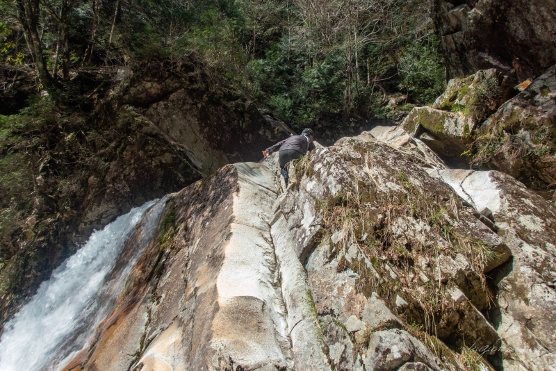 渓さんが水流左から登ろうとするが、ぬめりが強くかなり渋い様子。