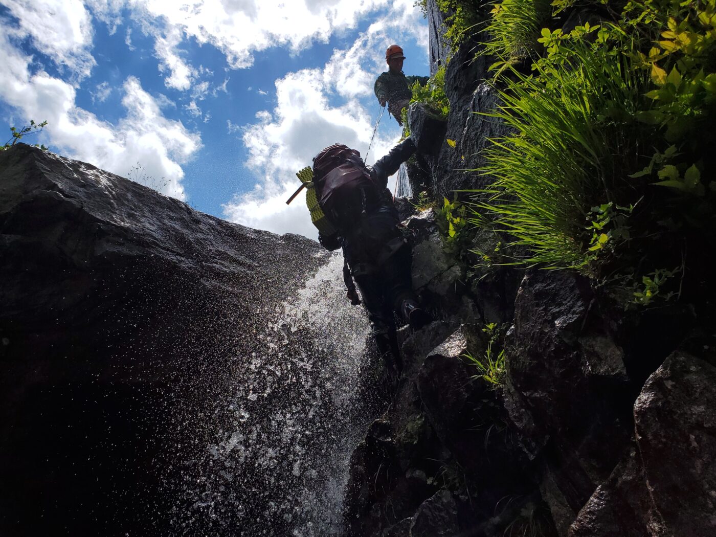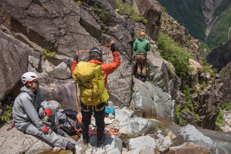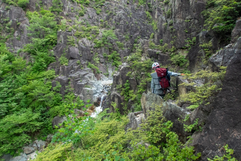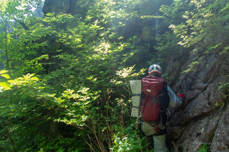 F3の巻きは左岸のルンゼを登り、途中からバンド状になっている個所からトラバースしていく。