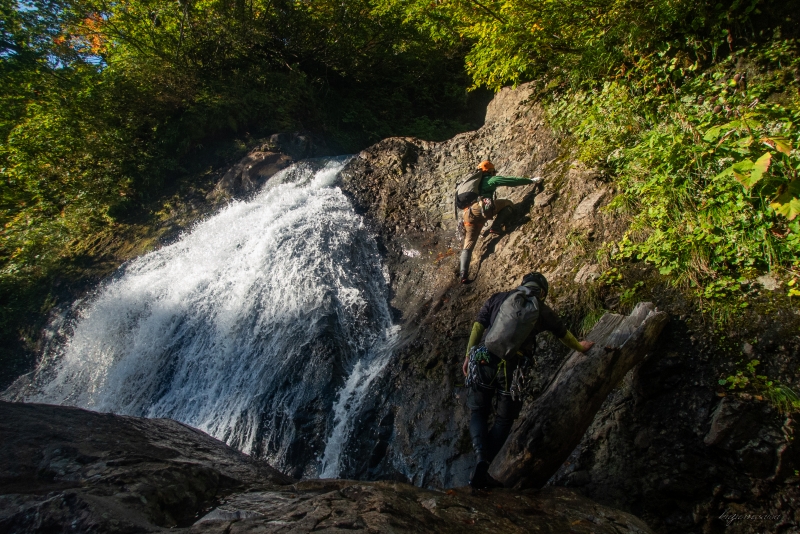 姿の良い10m2条滝は右壁から。沢ヤ達がスタスタと登ってゆくのを必死に追いかける。