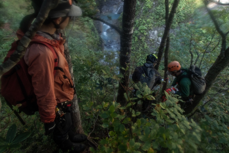 三ツ折の滝は右岸から高巻、懸垂下降で沢に戻る。