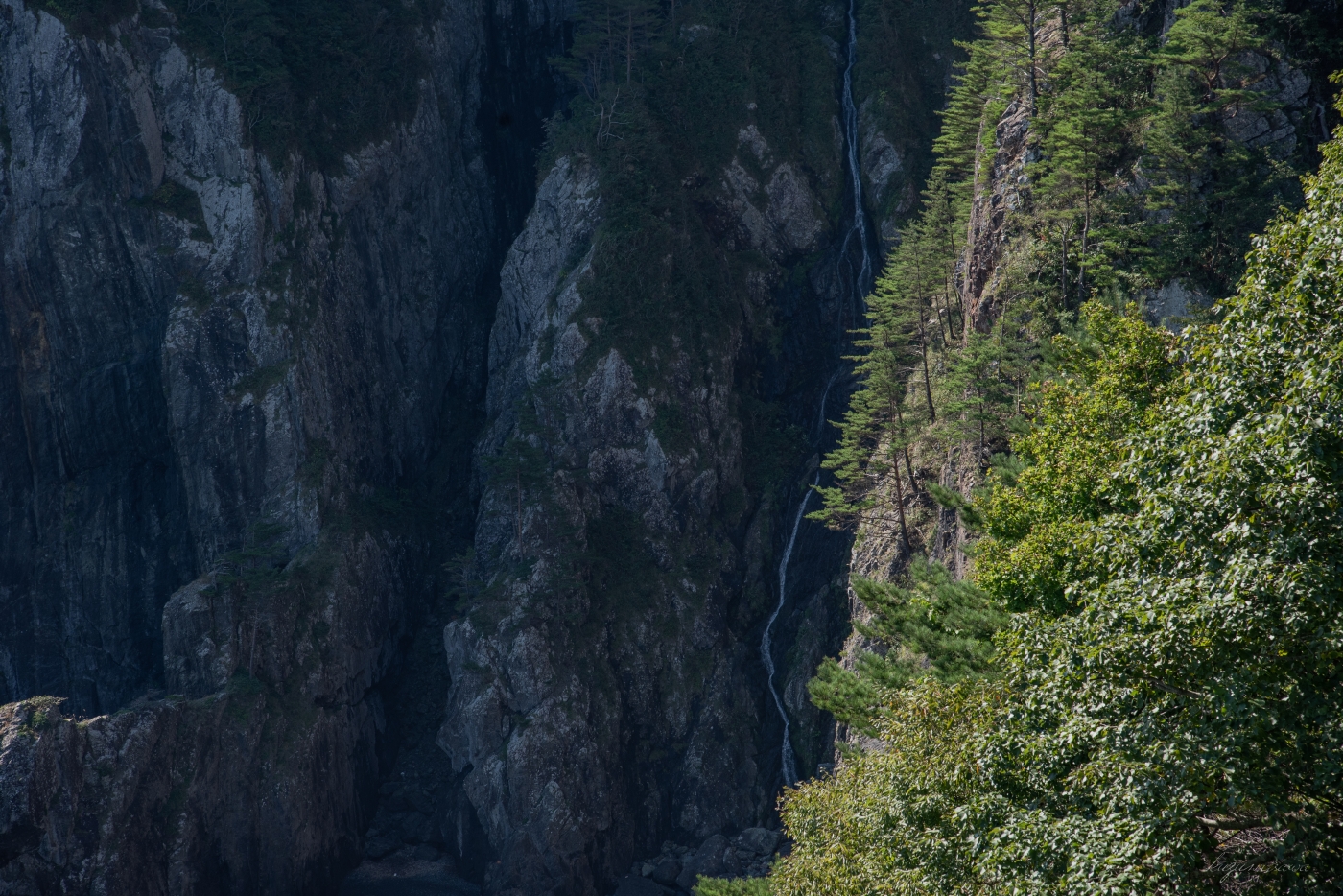 岩手県最大の落差を誇る150mの段瀑。さらに海へ流れ落ちる海岸瀑でもある。
