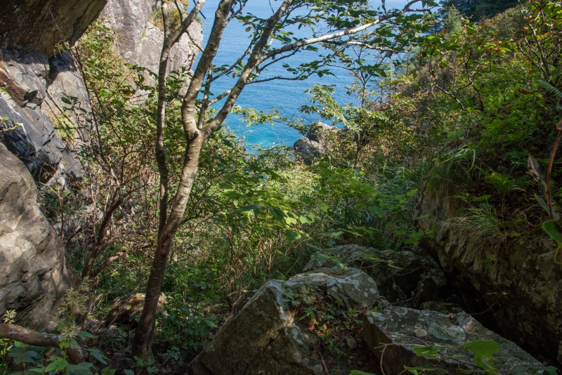 とりあえず沢を下り標高を落としてゆくが、滝の先がスパッと切れていて、その先に青い海が広がっているのが見える。