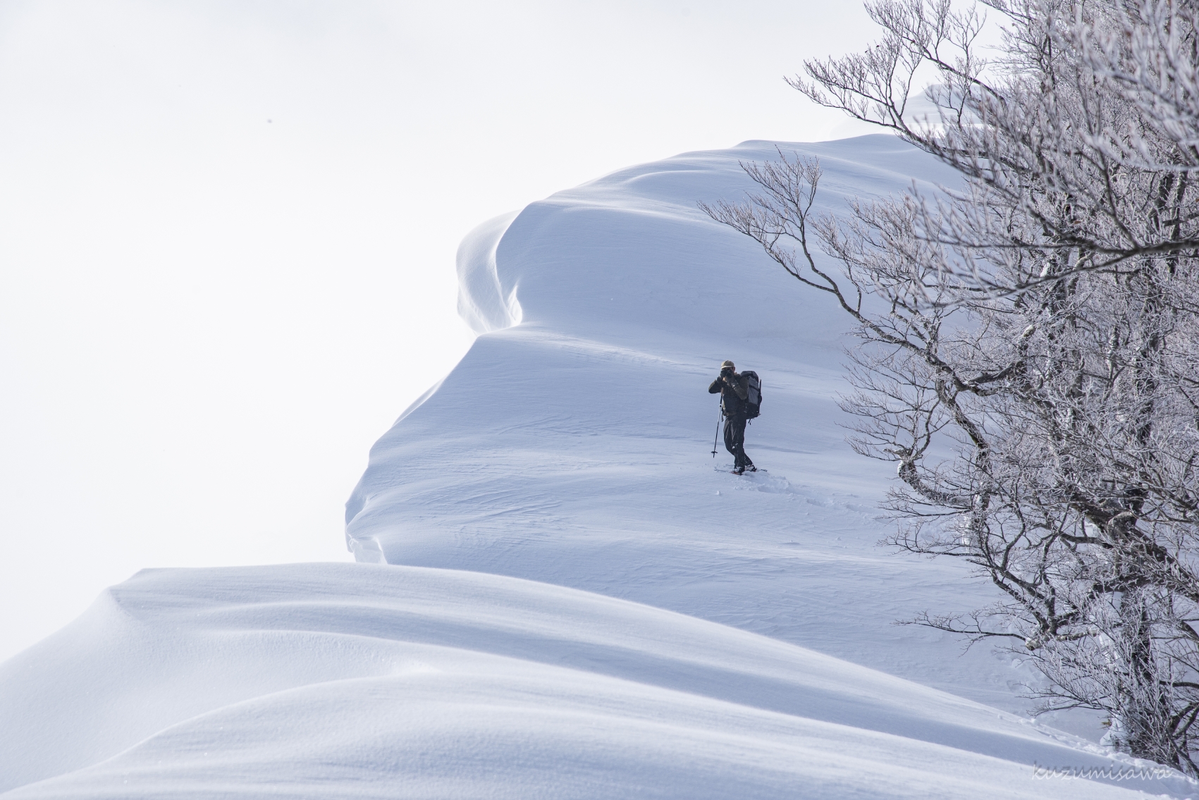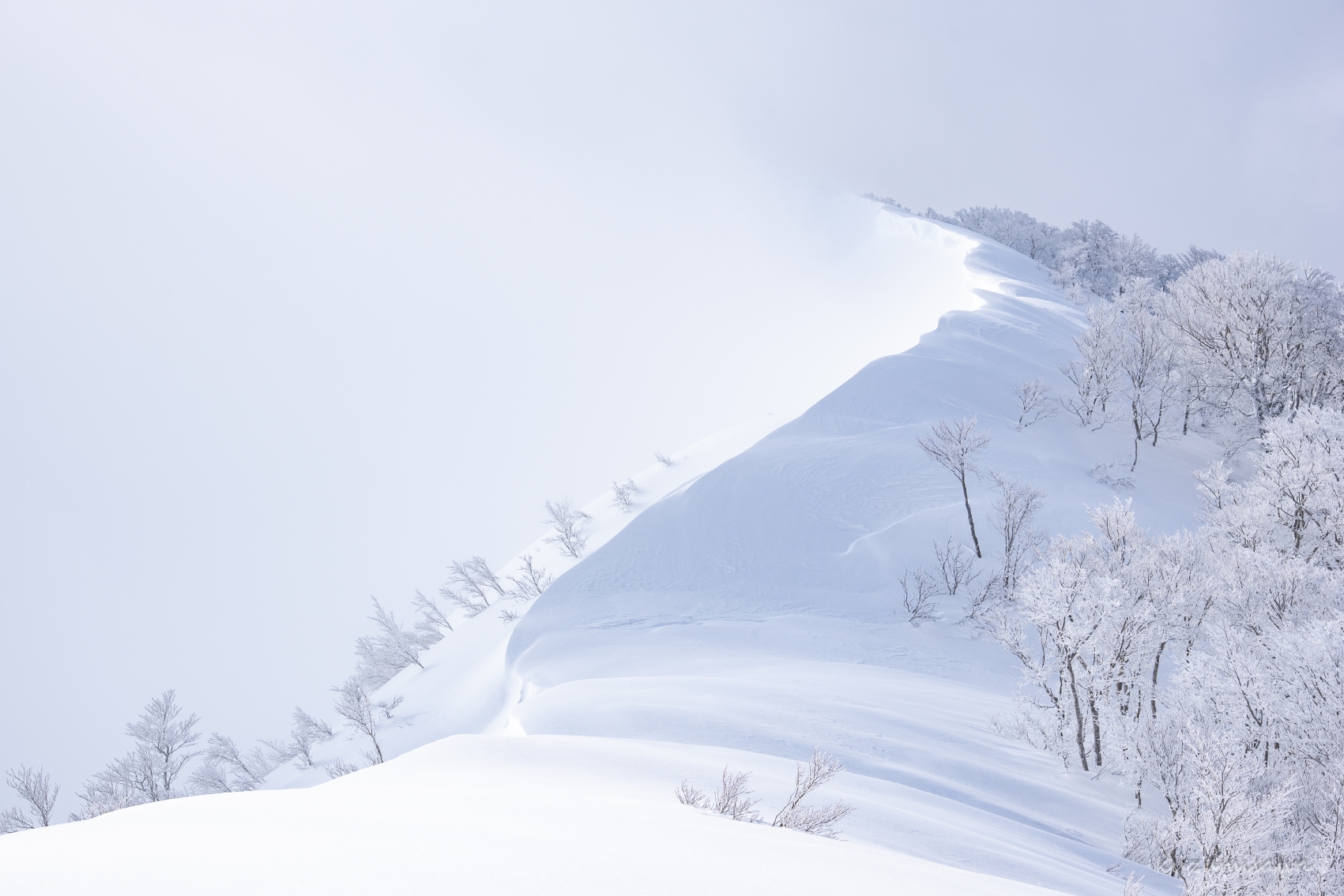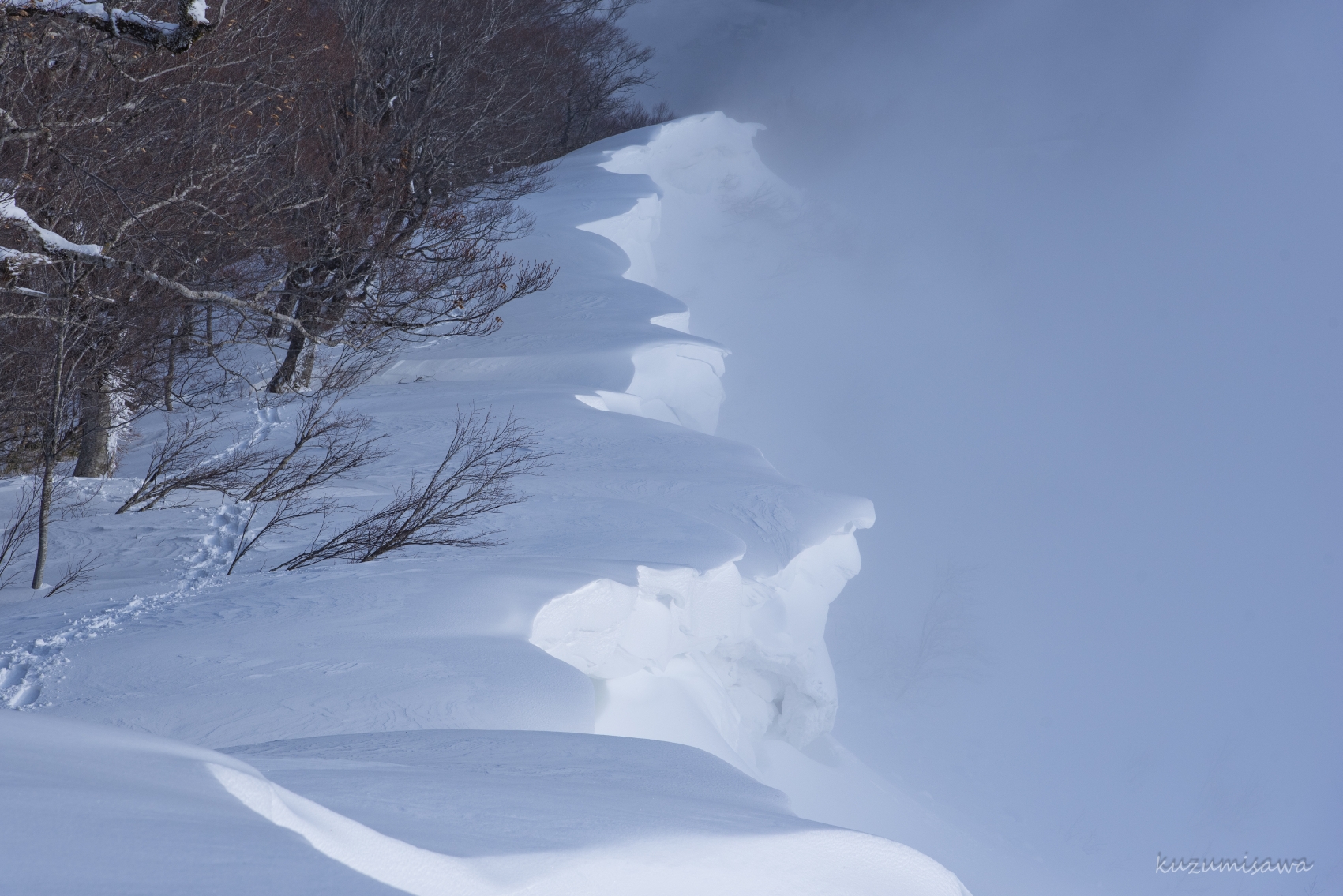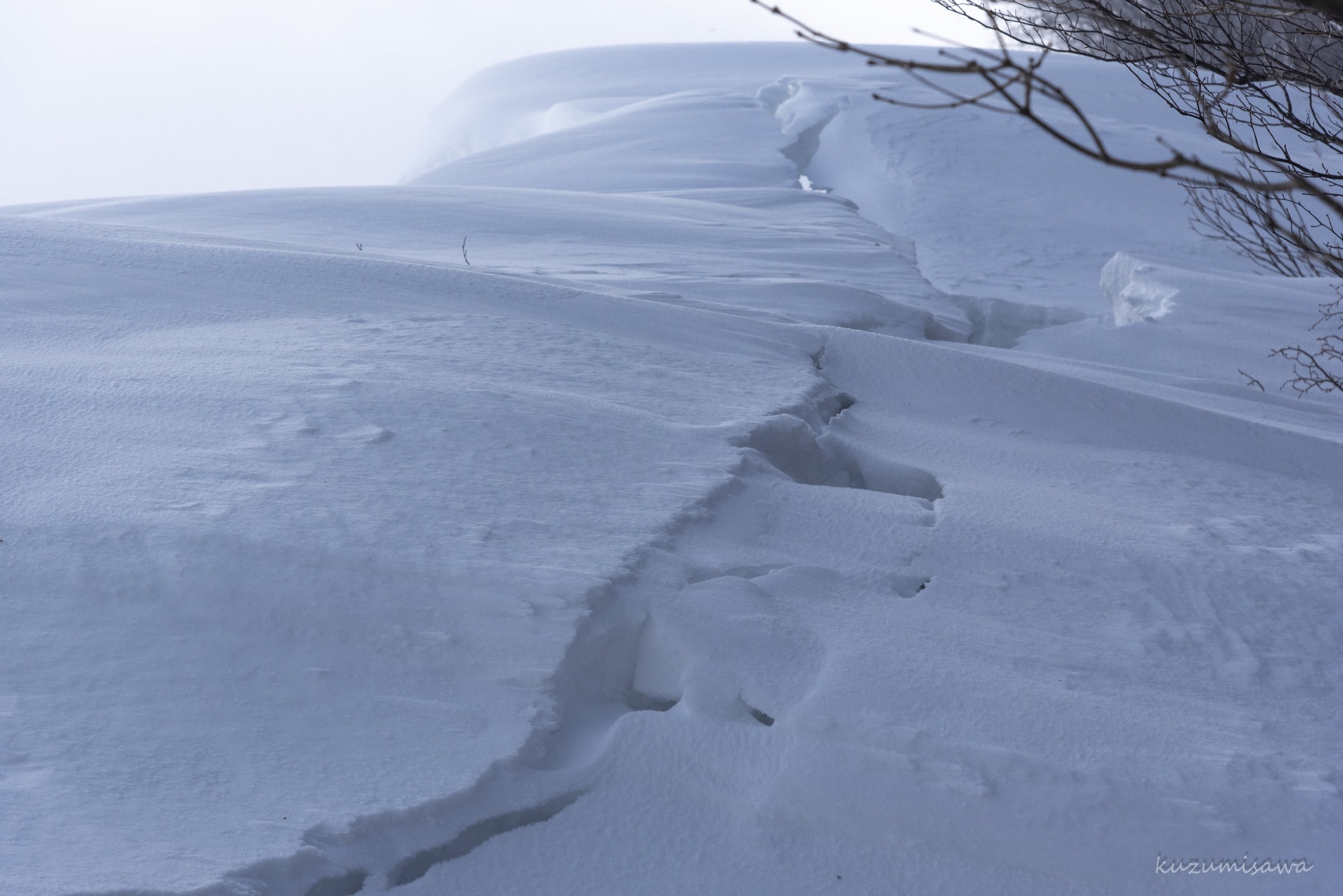 しかも稜線には雪庇の割れ目が縦に長く続いています。