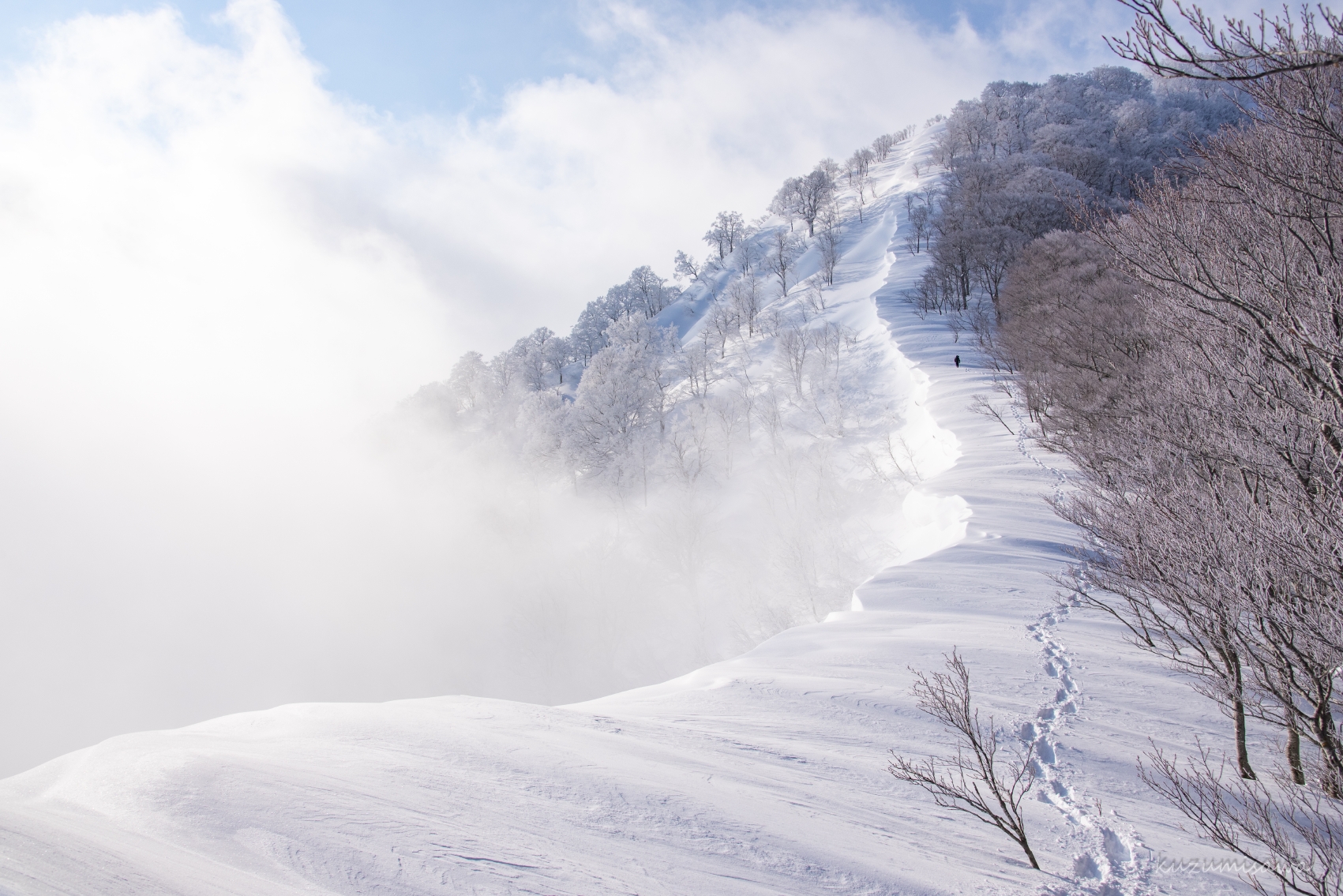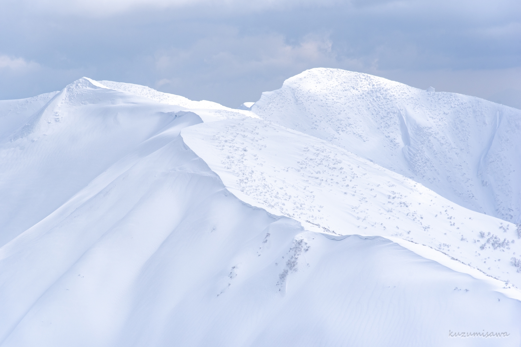 午前から日が出て、すぐに気温が上がってもしょうがないのでまだいいのですが、前神室山から神室山への稜線では晴れてほしいですね。