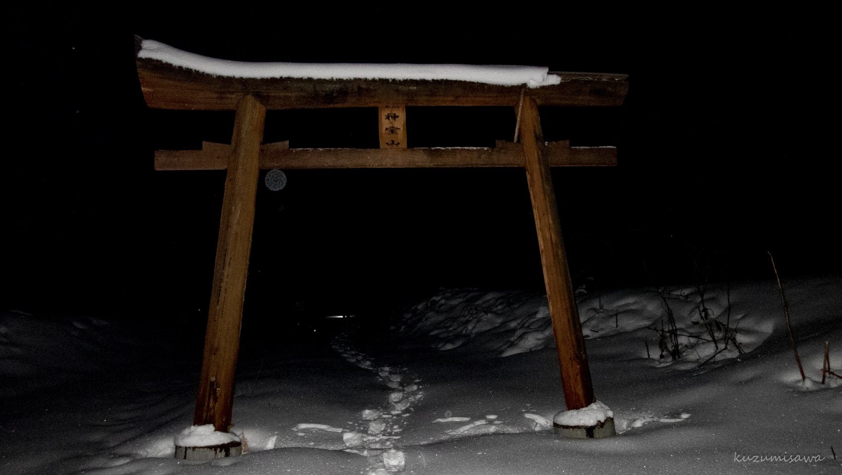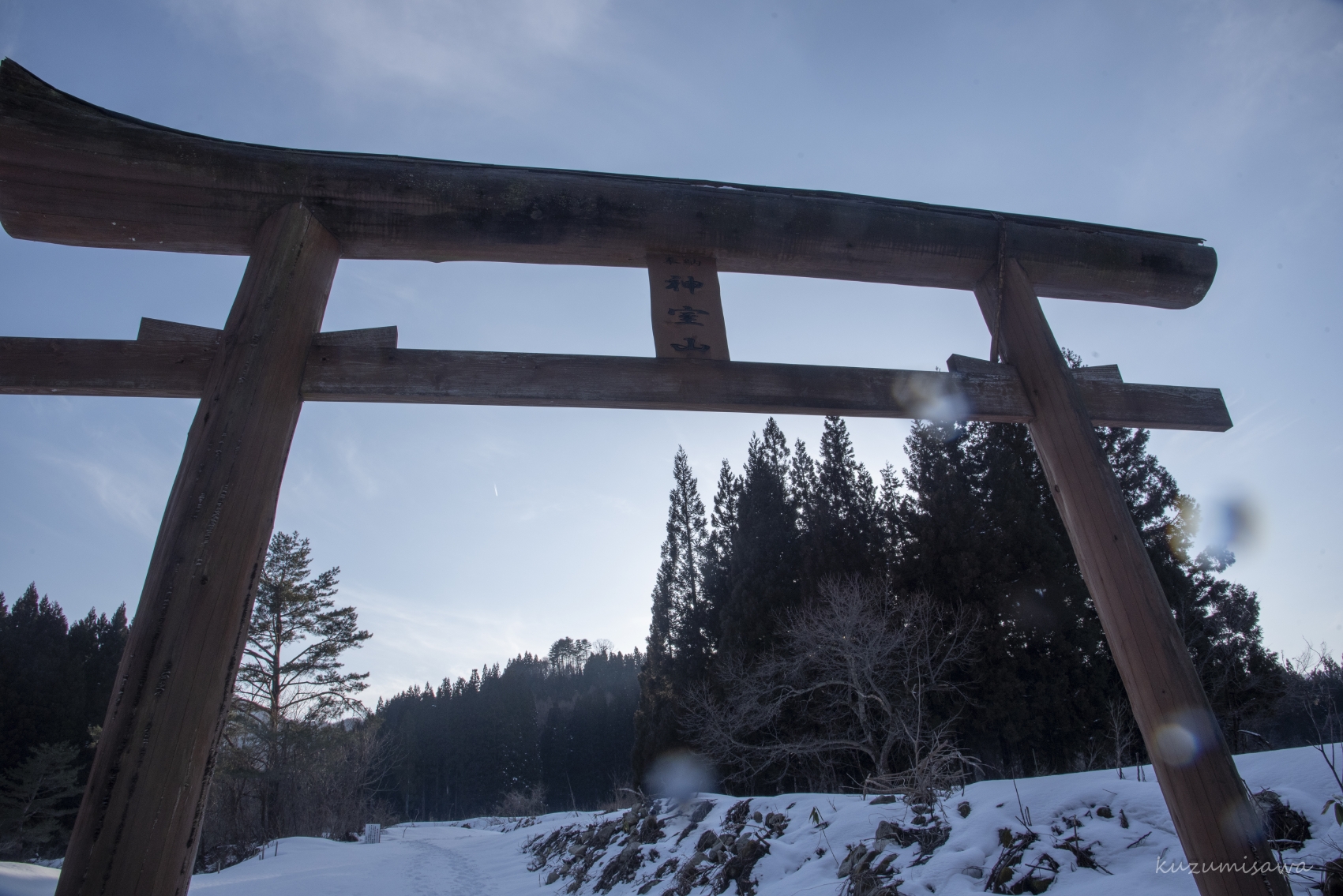 夏ならパノラマコースの登山道の開始地点まで行けるようですが、積雪期は役内集落から少し林道に入った「神室山」の鳥居までしか進めません。