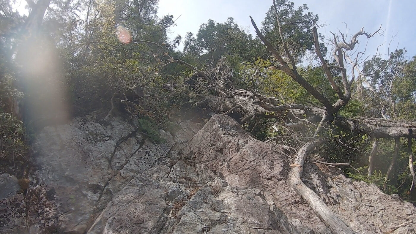 鎖はあるのでそこまで危ないわけではないが、行く手を遮るように倒木が倒れている。