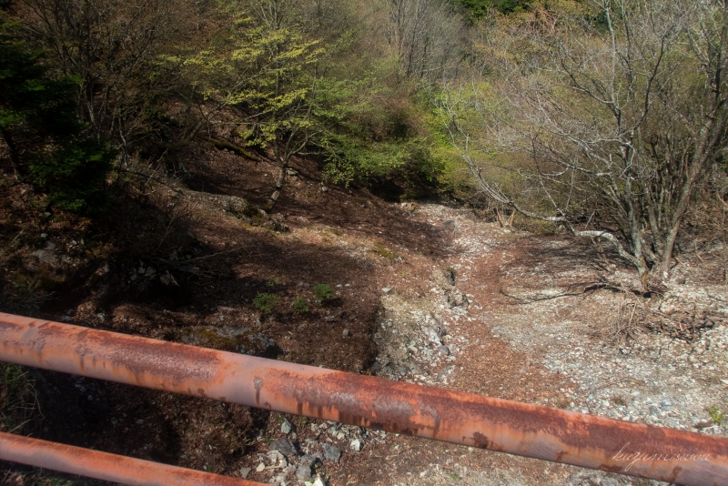 この橋のザレ場から滝壺に下れるそうだ。