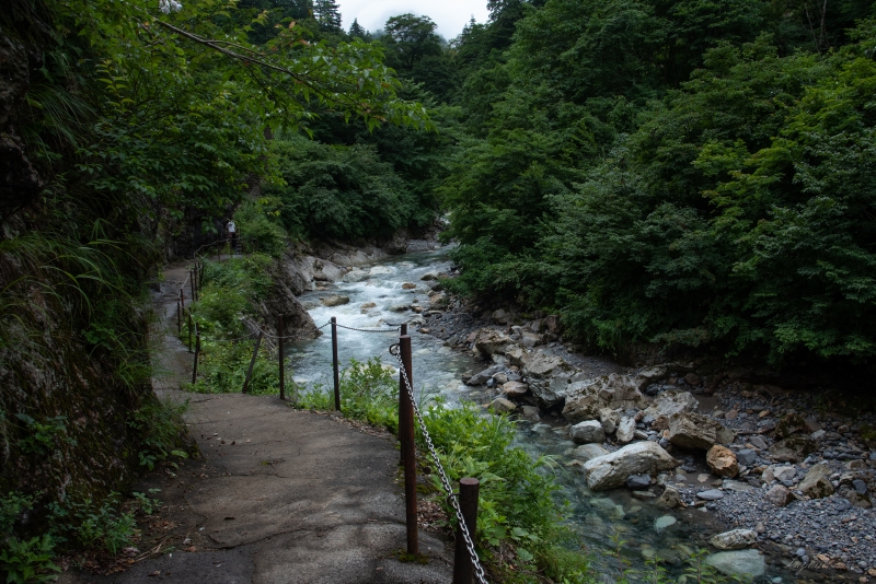 この先に親谷の湯があり、その対岸に姥ヶ滝が流れ落ちている。