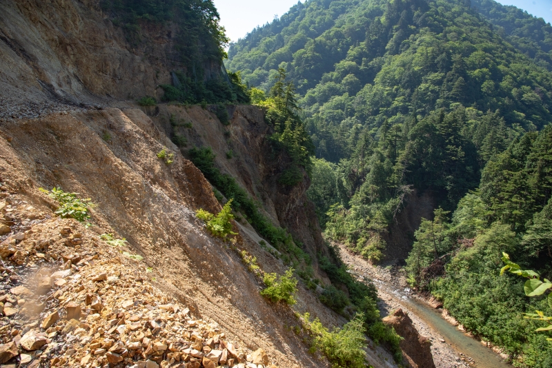ふと顔を上げると崩壊した岩肌が見えてきた。
