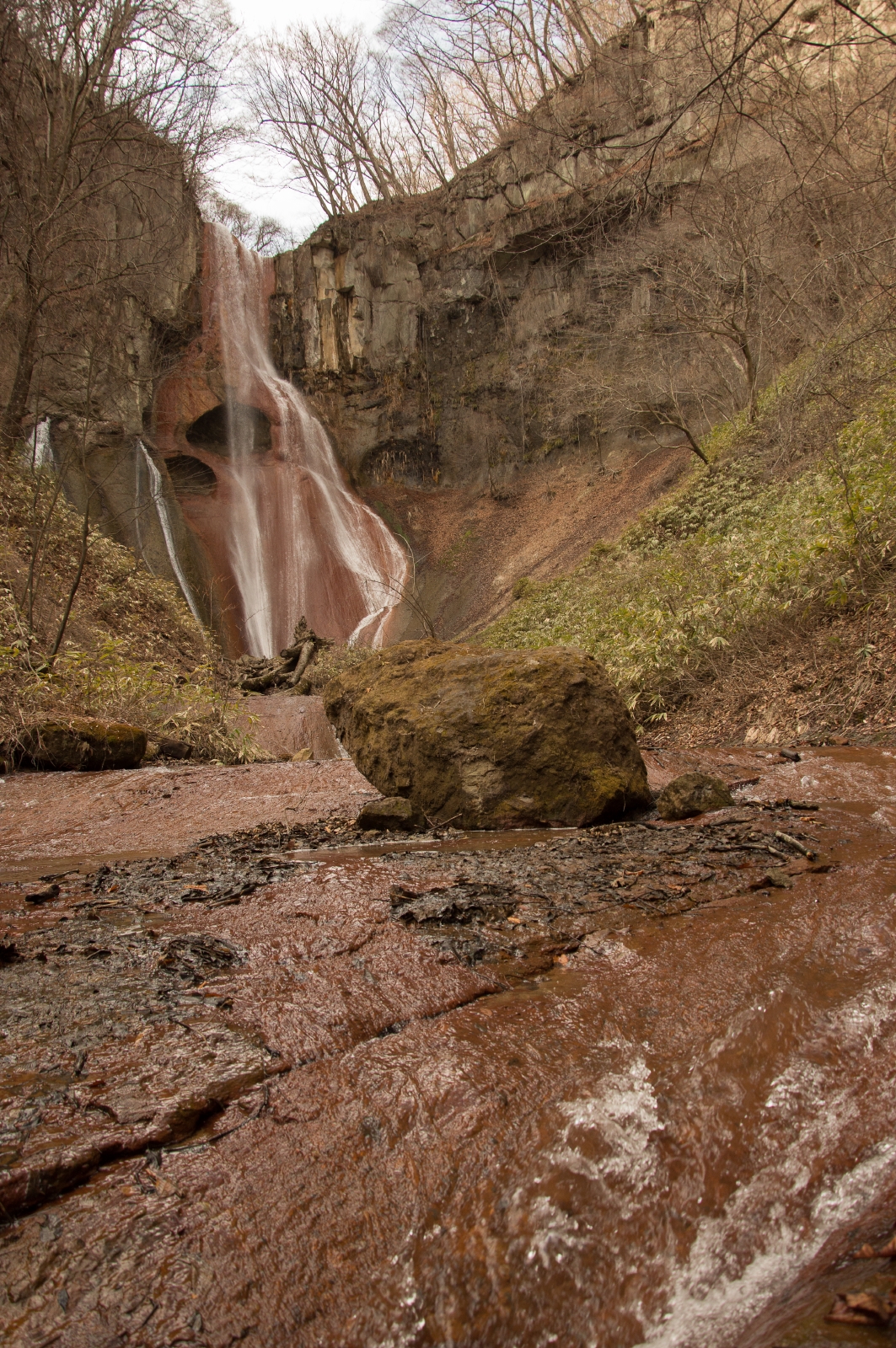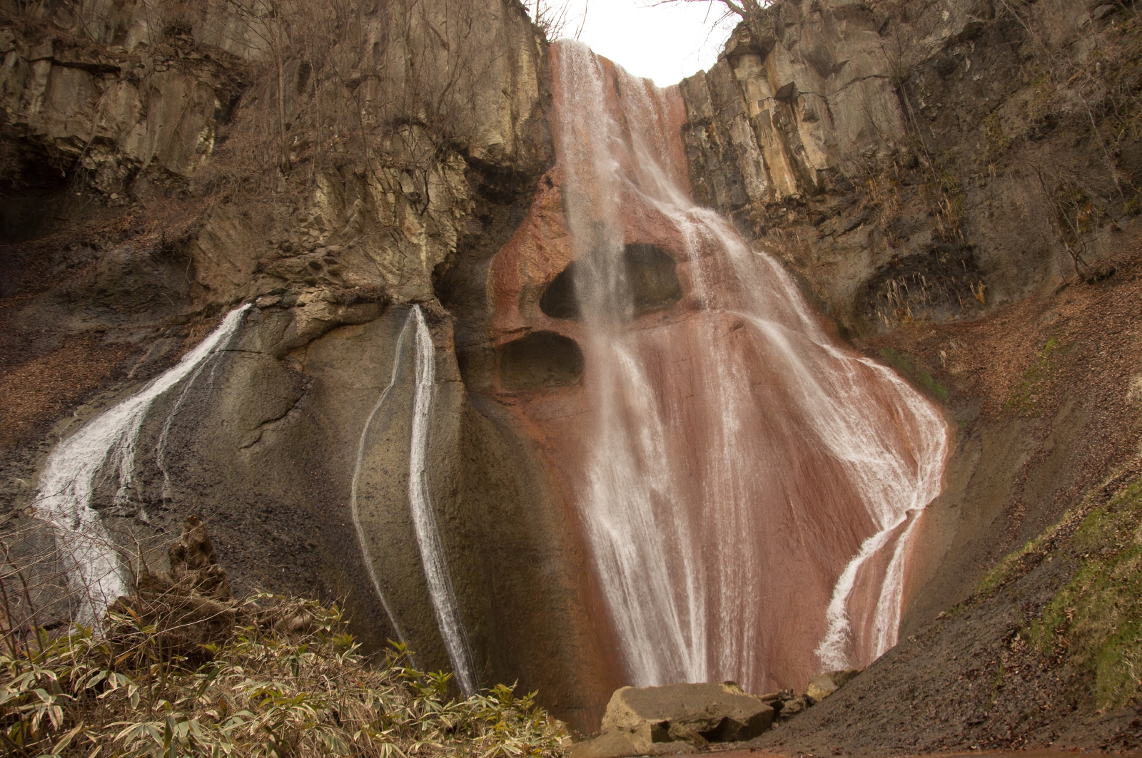 中央の流れは大穴を跨ぎまっすぐ流れ、 右の流れは赤褐色の岩肌をなめながら滑り落ちていく 、 左の流れは凝灰岩と花崗岩(おそらく)の間から流れ出る潜流瀑 。まさに奇妙奇天烈、奇瀑一つ。日本三大奇瀑