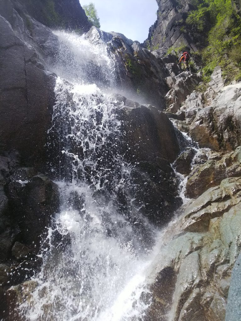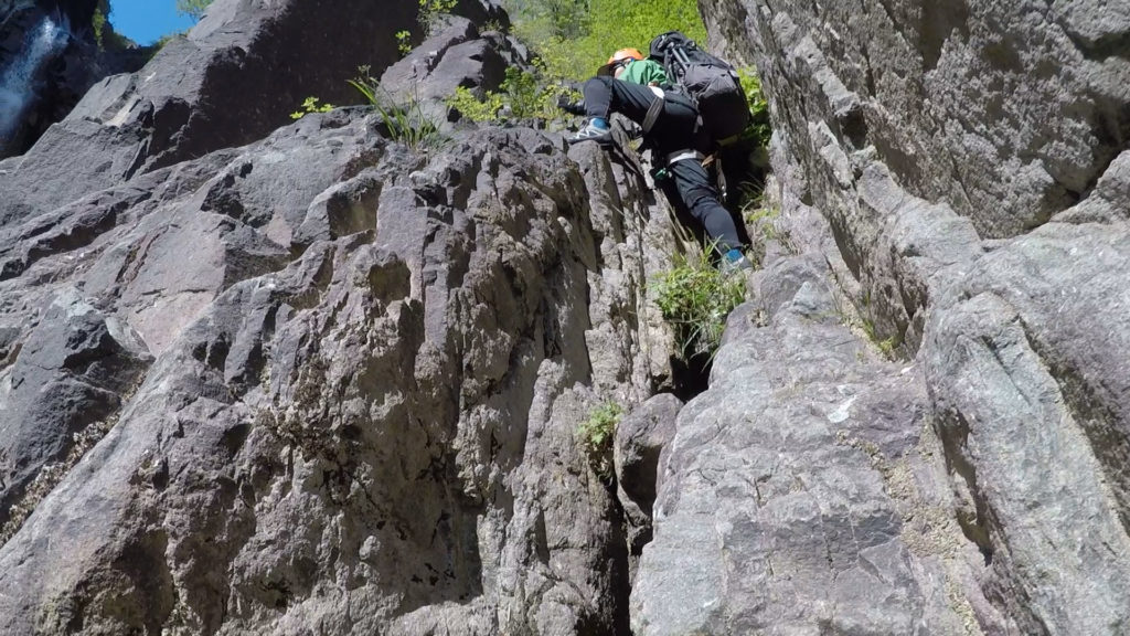 本来なら右岸をショルダーでクリアするのが正攻法かと思いますが、いつの間にか滝ぺい氏が左岸を小巻していたのでロープを出してもらいユマーリング