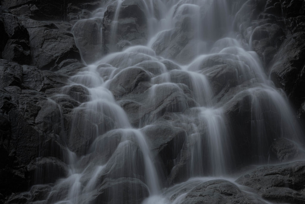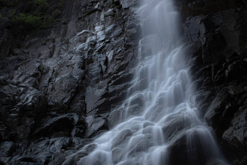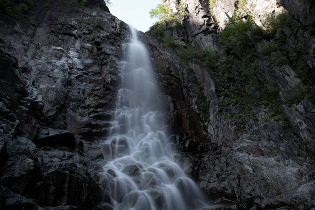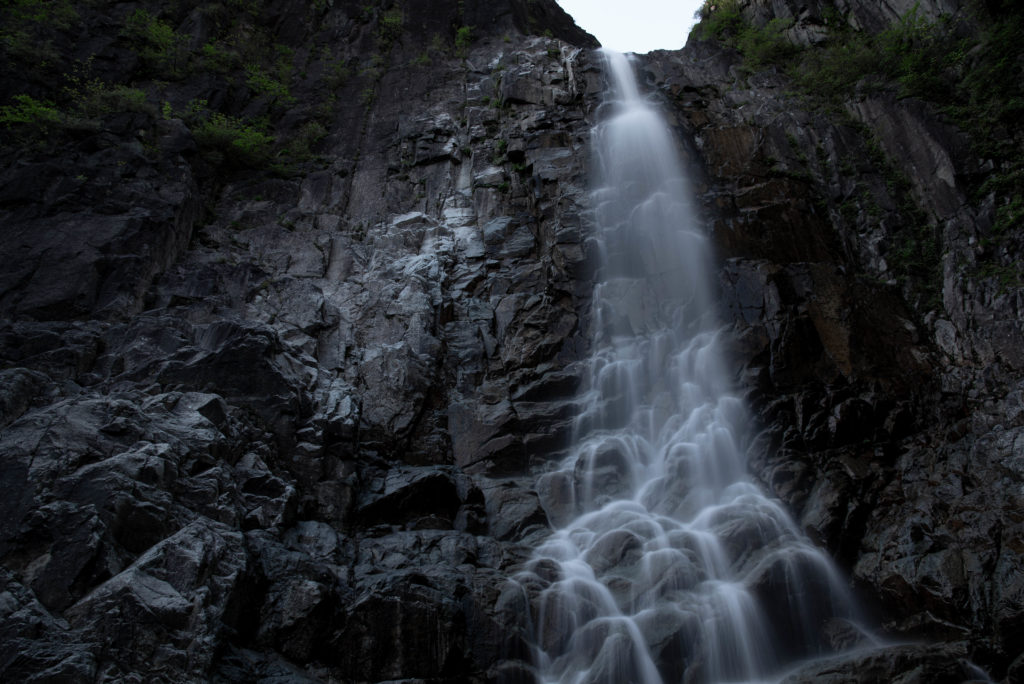 落ち口は窄まって落ちるが、岩にぶつかり広がり、下部ではうろこのようにまた広がります