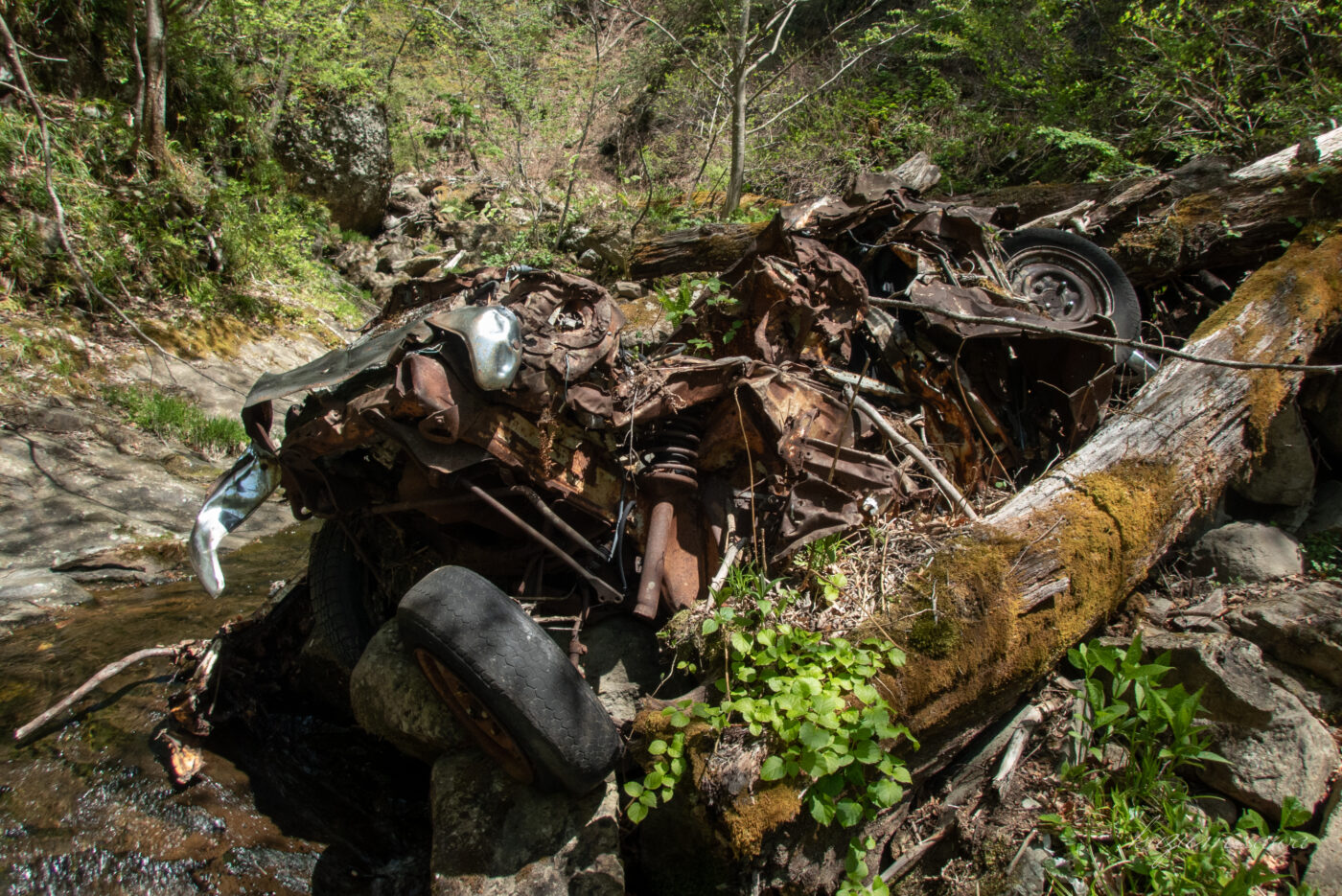 少し沢を歩くとボロボロの廃車がお出迎えしてくれる。