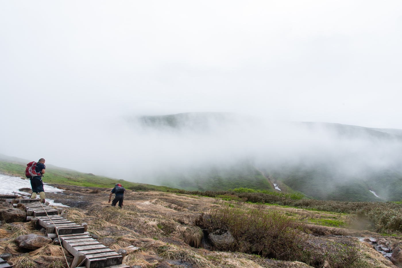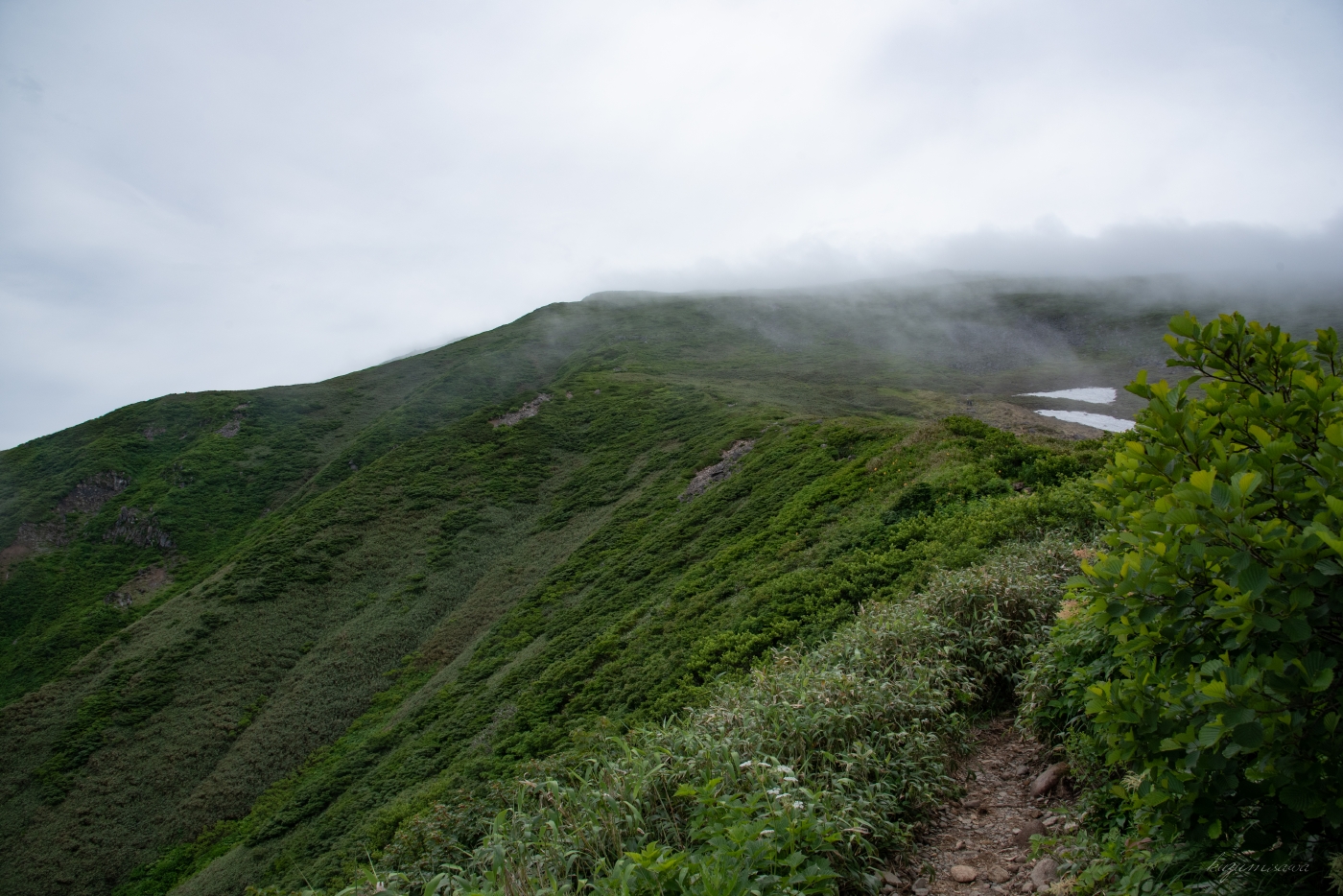 ガスは未だかかっているものの、姥ヶ岳と月山の稜線に向かうにつれ、ガスも薄くなってきています。