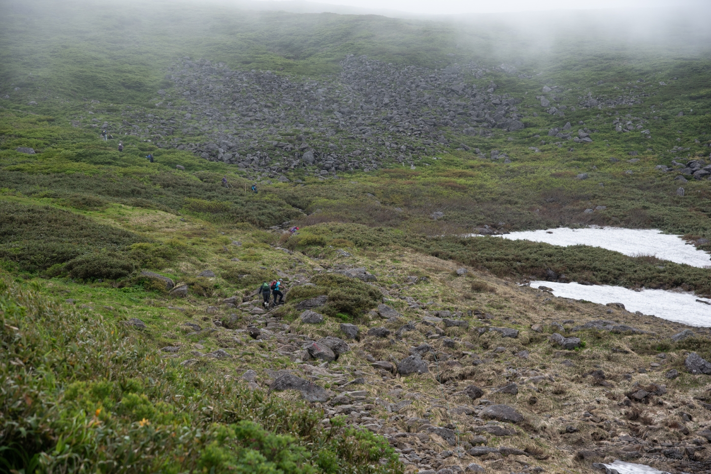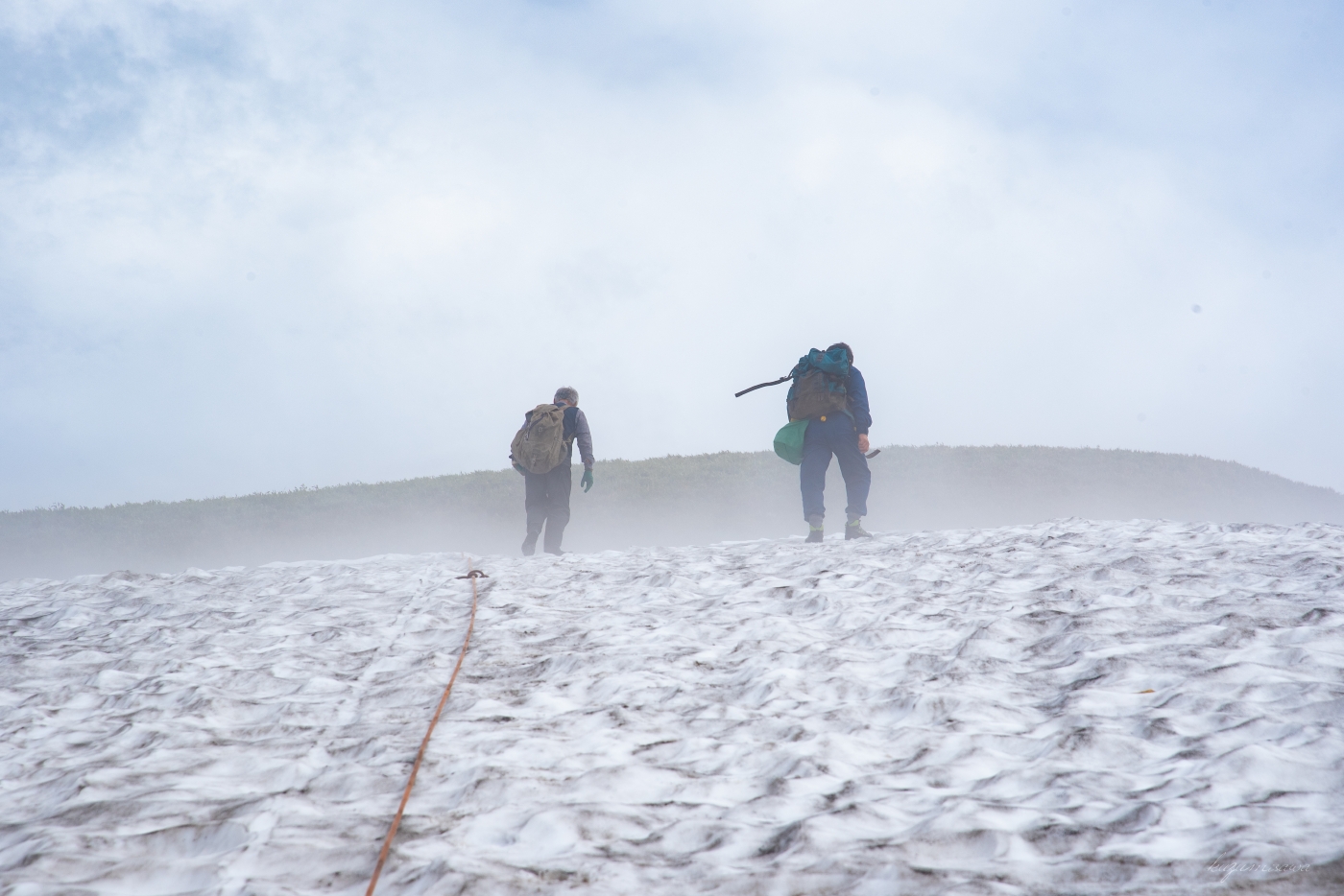 ところどころ登山道にかかる雪渓を乗り越えながら進みます。