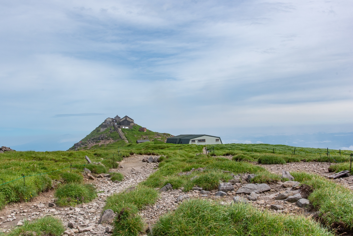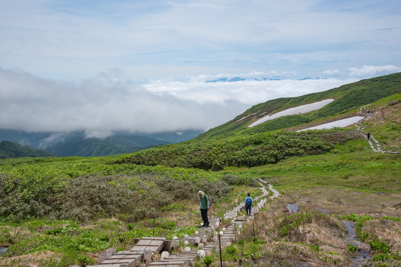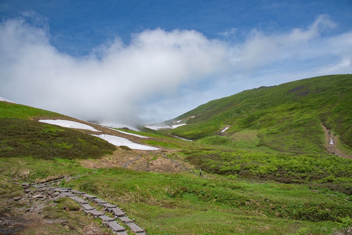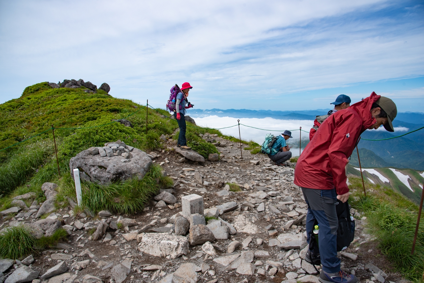 山頂のなだらかな草地、夏でも残る雪渓、登山道を彩る高山植物を楽しむことが出来る。