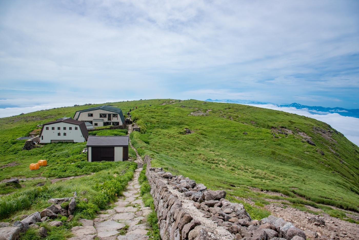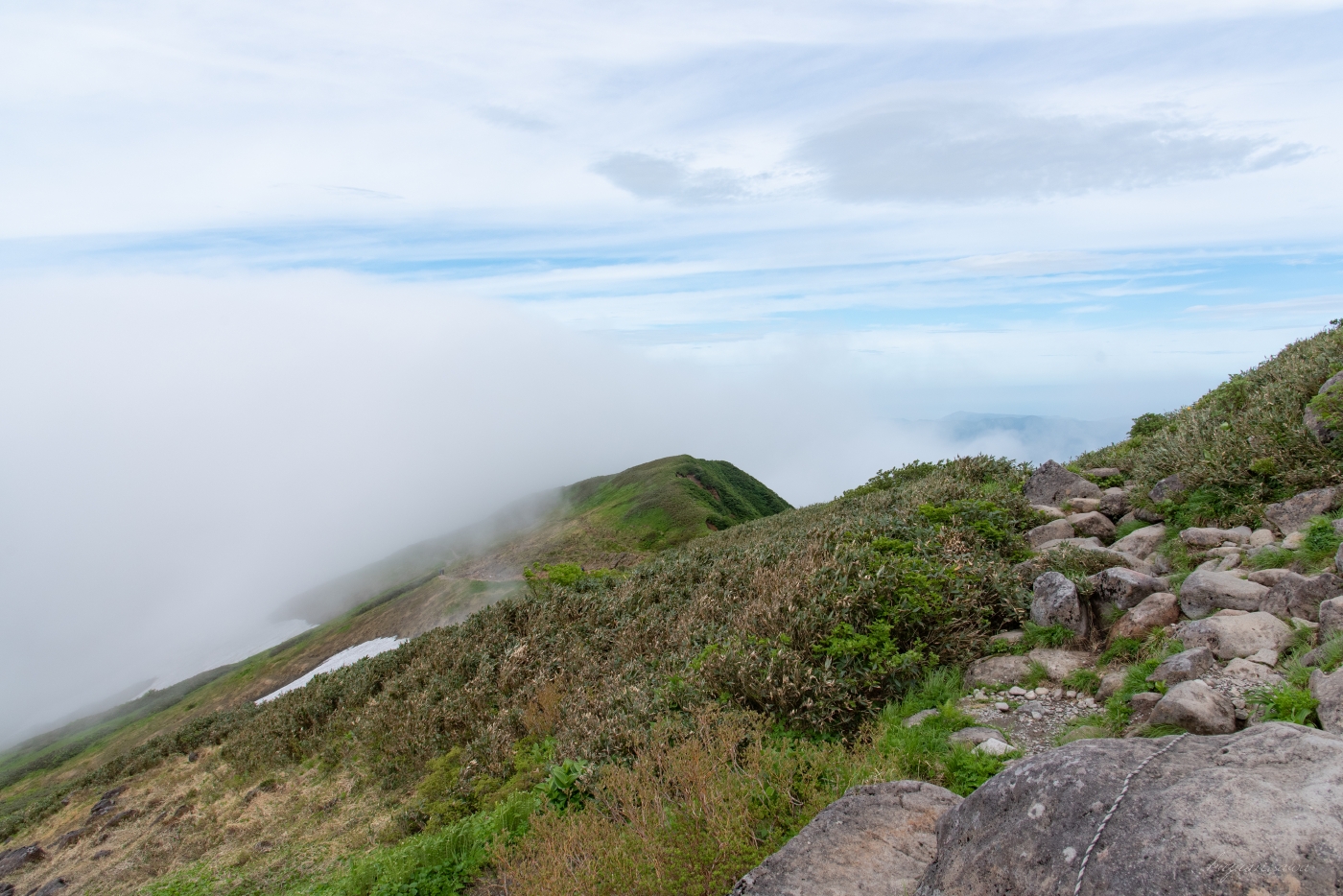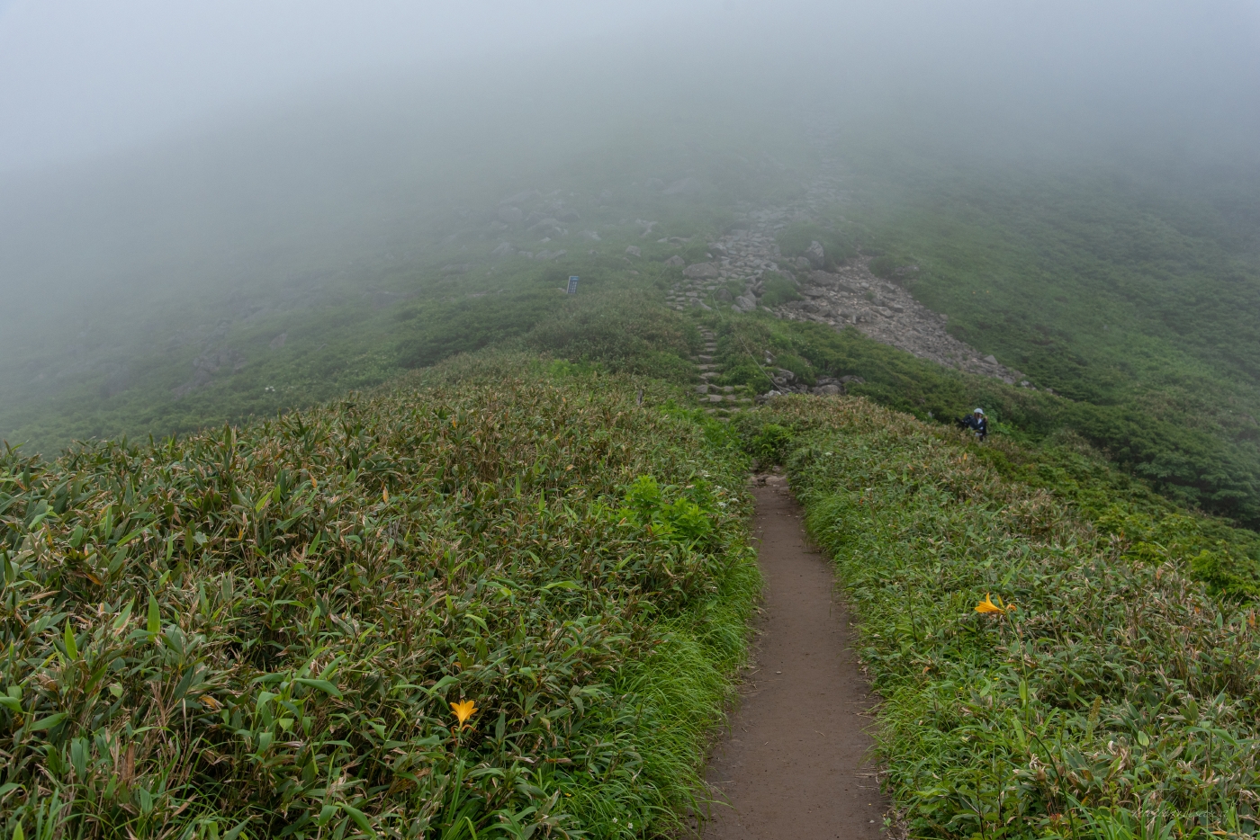 山頂のなだらかな草地、夏でも残る雪渓、登山道を彩る高山植物を楽しむことが出来る。