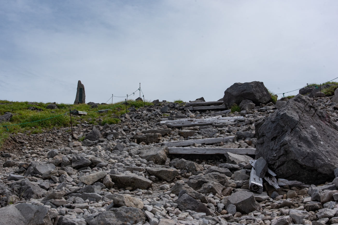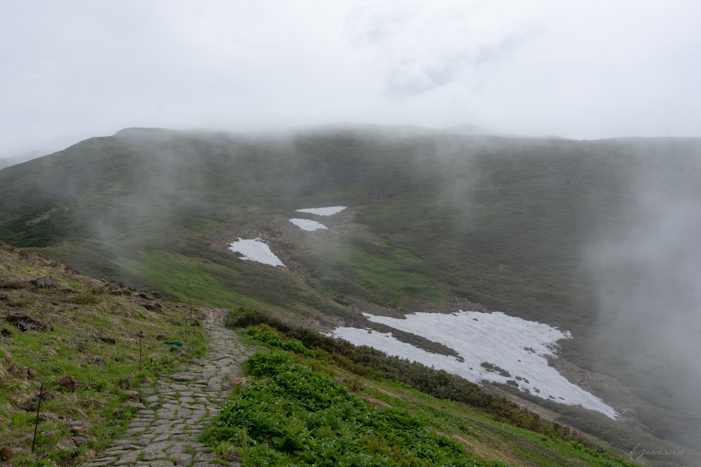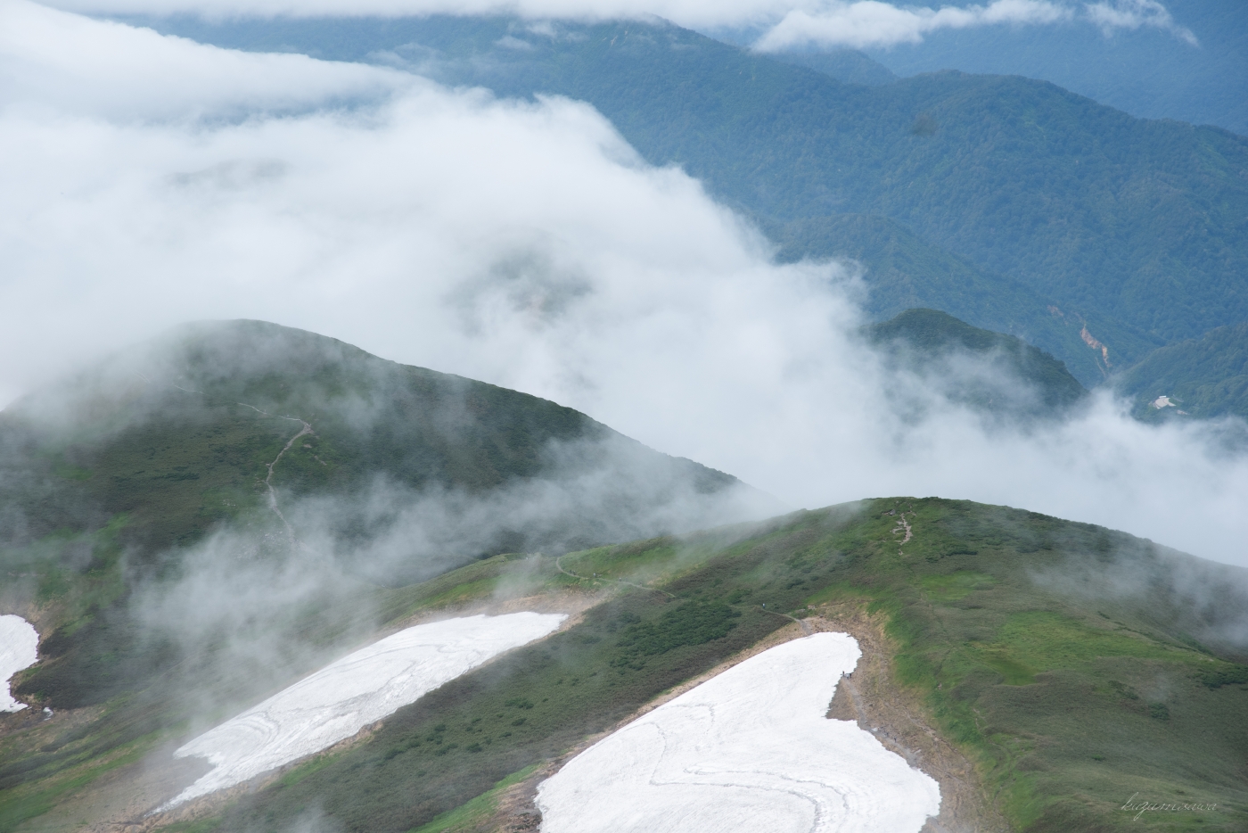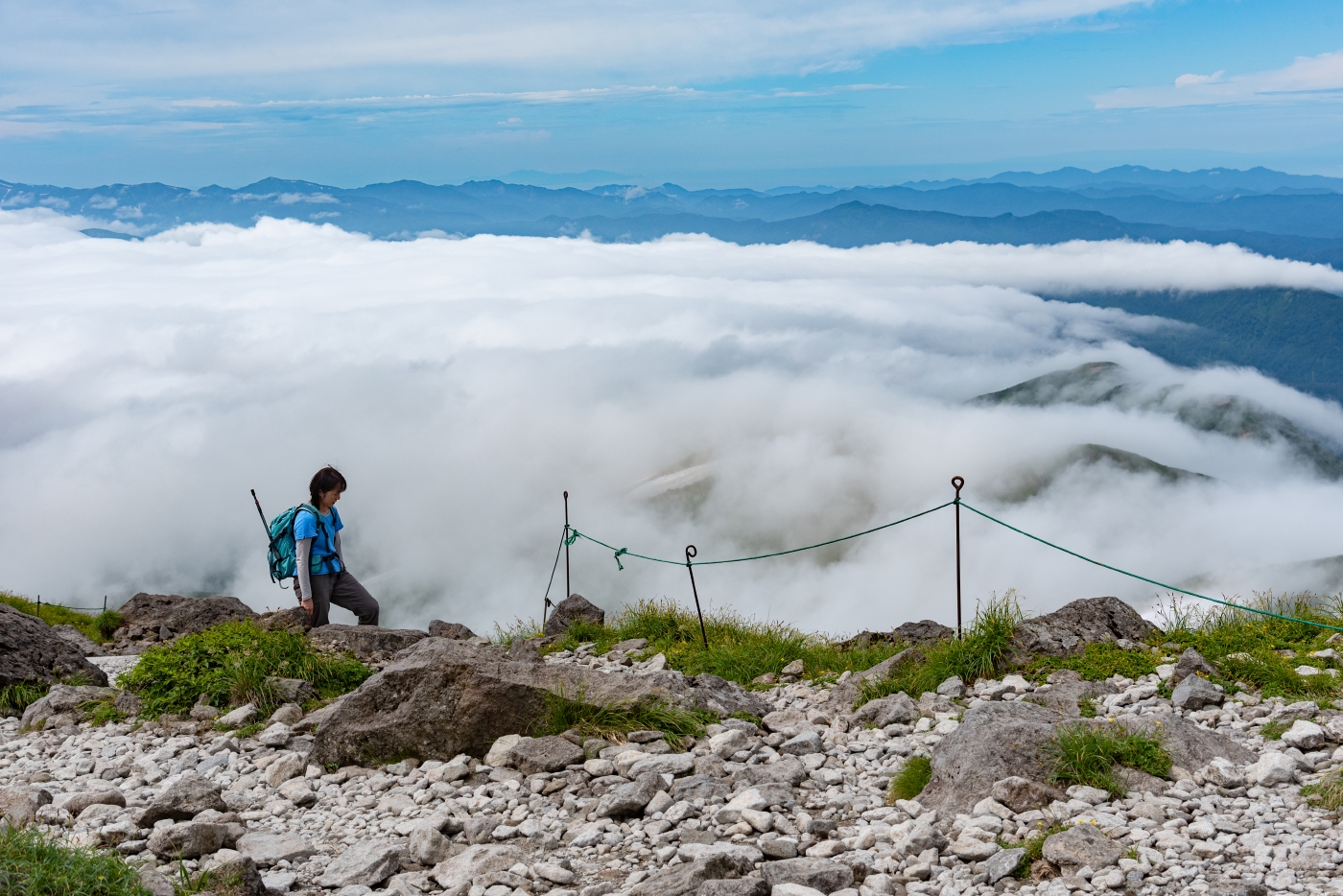 山頂のなだらかな草地、夏でも残る雪渓、登山道を彩る高山植物を楽しむことが出来る。