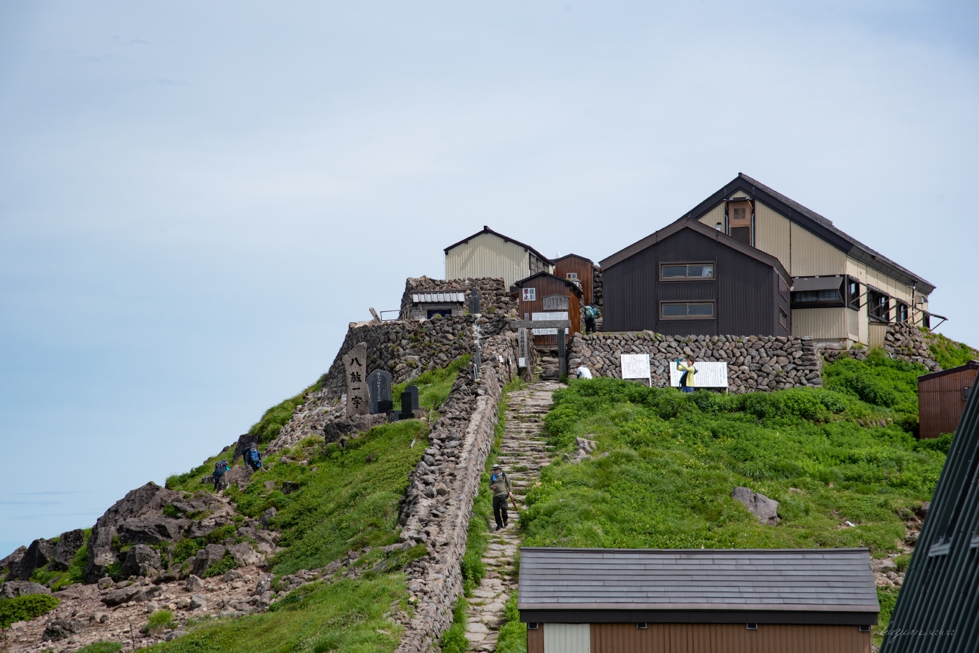 月山頂上小屋と月山神社の本宮が見えてきました。