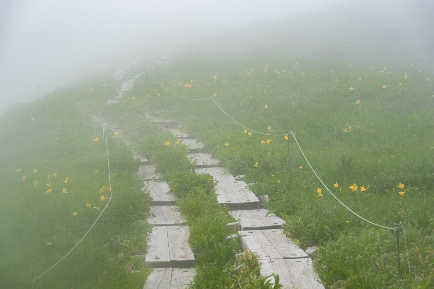 姥ヶ岳の山頂は湿地になっており、ニッコウキスゲが咲き乱れています。