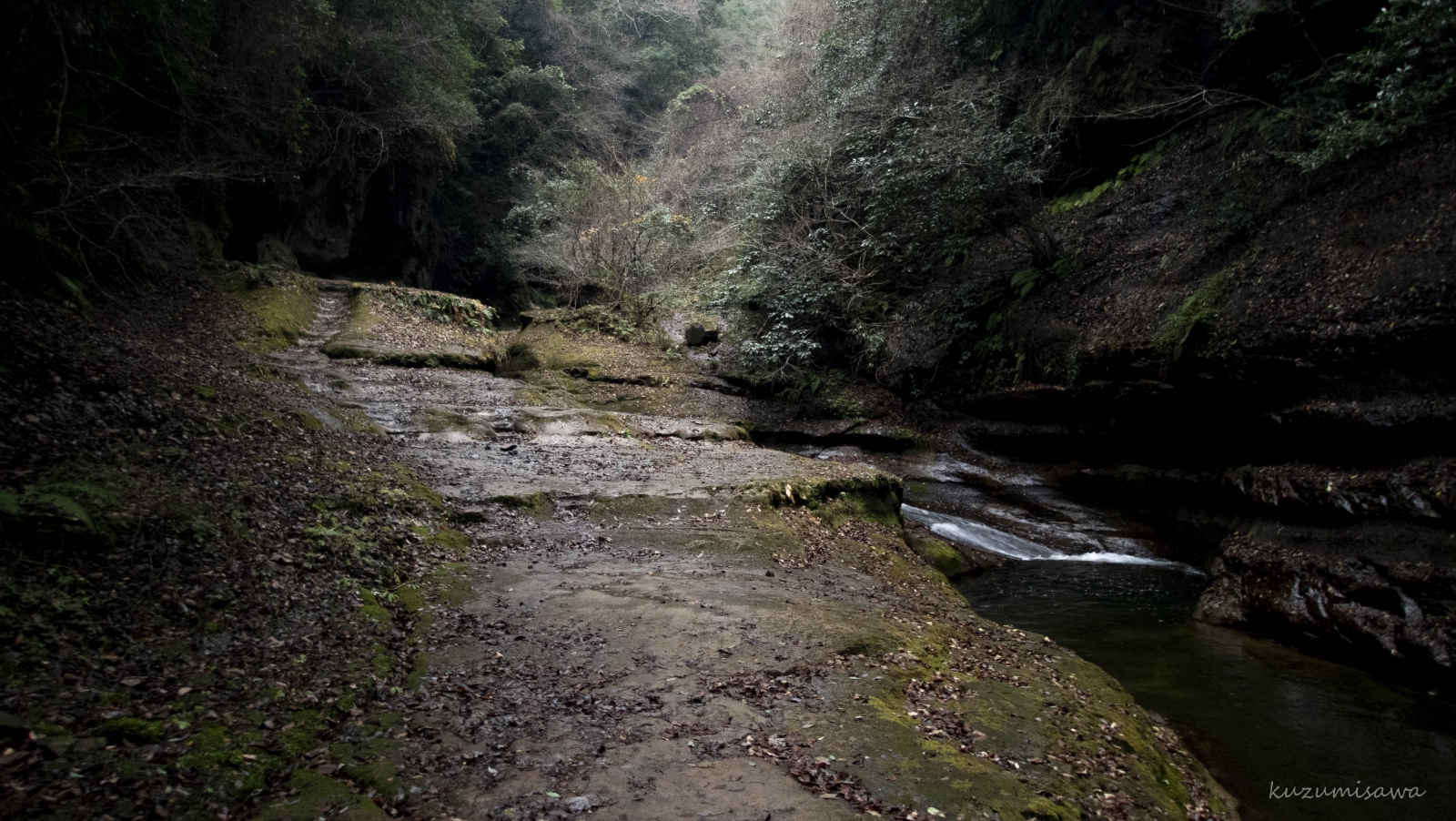 滝壺から沢への流れ口に渡渉用のコンクリの舗装があり少し残念ですが…