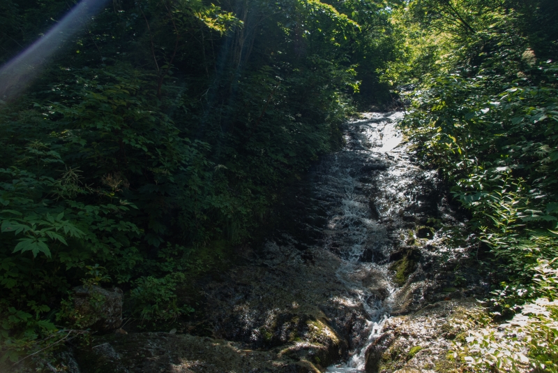 沢に差し込む太陽のおかげで沢の水が涼しくて気持ちいい。