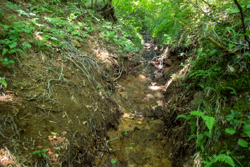 登山道に近づくように分岐を選んでいくと水もようやく枯れてきた。