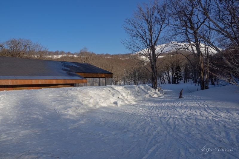 舗装路から雪原に入り、少し歩くと県立自然センターに到着。