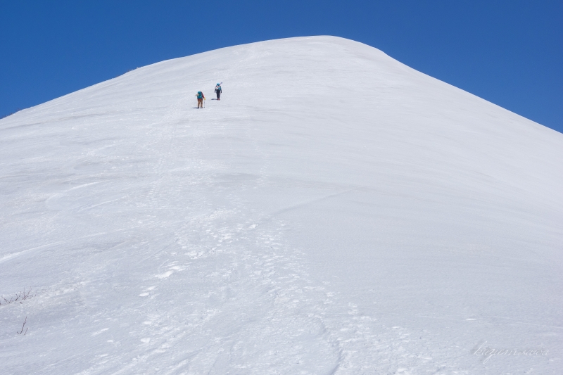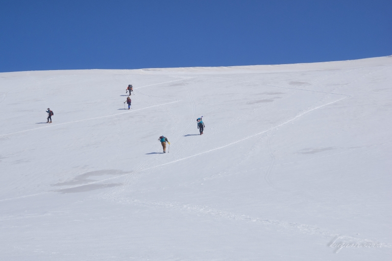 かなり締まっている雪質だったのでここでアイゼンを装着。