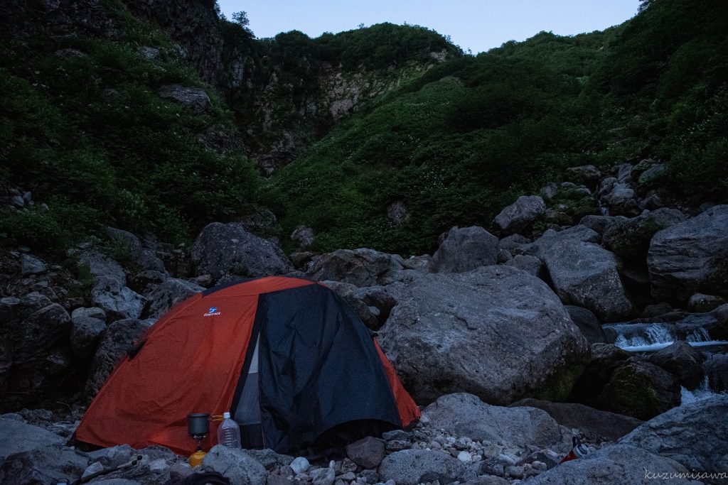 滝壺で十二分に飛沫を浴びてしまったのでテント内で寒さで凍える私