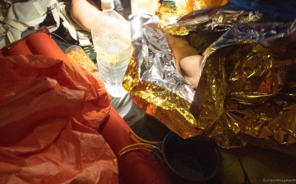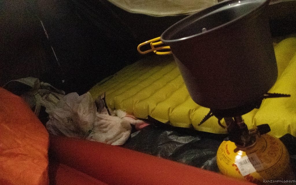 テント内でお湯を沸かしながらドライフードで体を温めます