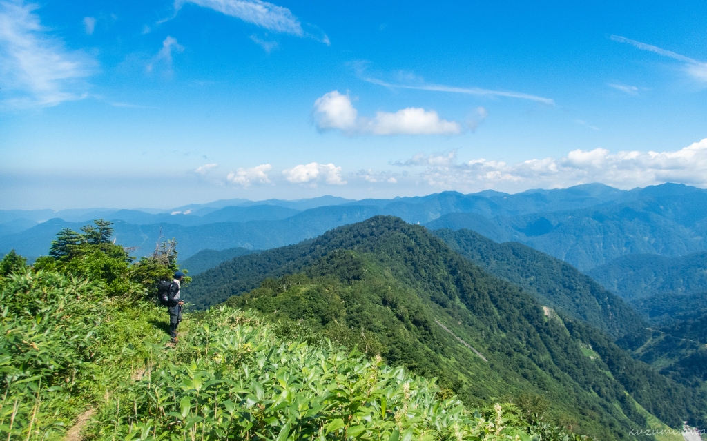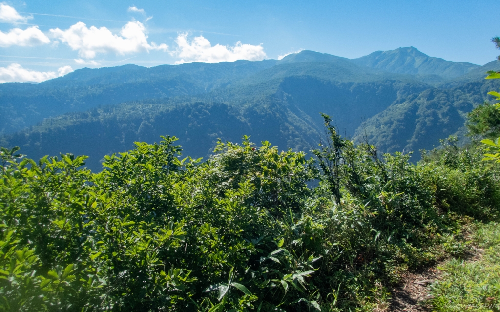 左手に沢を見下ろしながらの稜線歩き、太陽も高度を上げ、容赦なく私たちを照りつけます