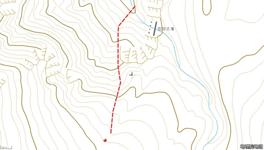 (左の赤丸が百四丈滝・右の丸が四丈岩です)