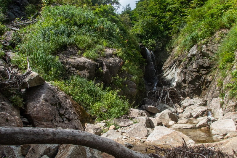 結局無理せず右岸枝沢から巻き、落口までは草付きをトラバースした。