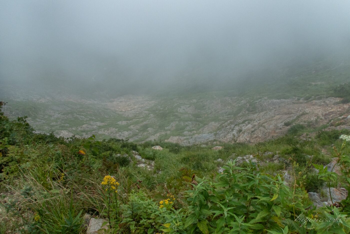 タカツコ沢の源頭を覗くと、ガスの中にうっすらと今登ってきたスラブが見えた。