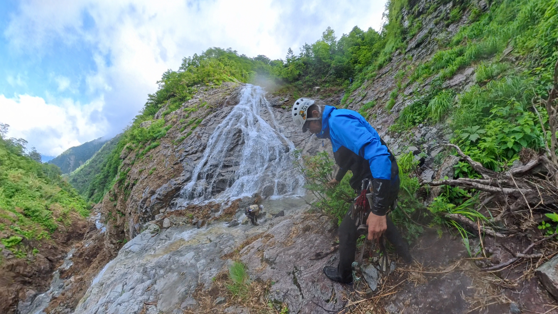 流身の右からでも左からでも登れるようだが、どちらにしてもロープは出したほうがいいだろう。二の滝は他の二本の滝と比べるとずいぶんと小柄な滝だ。