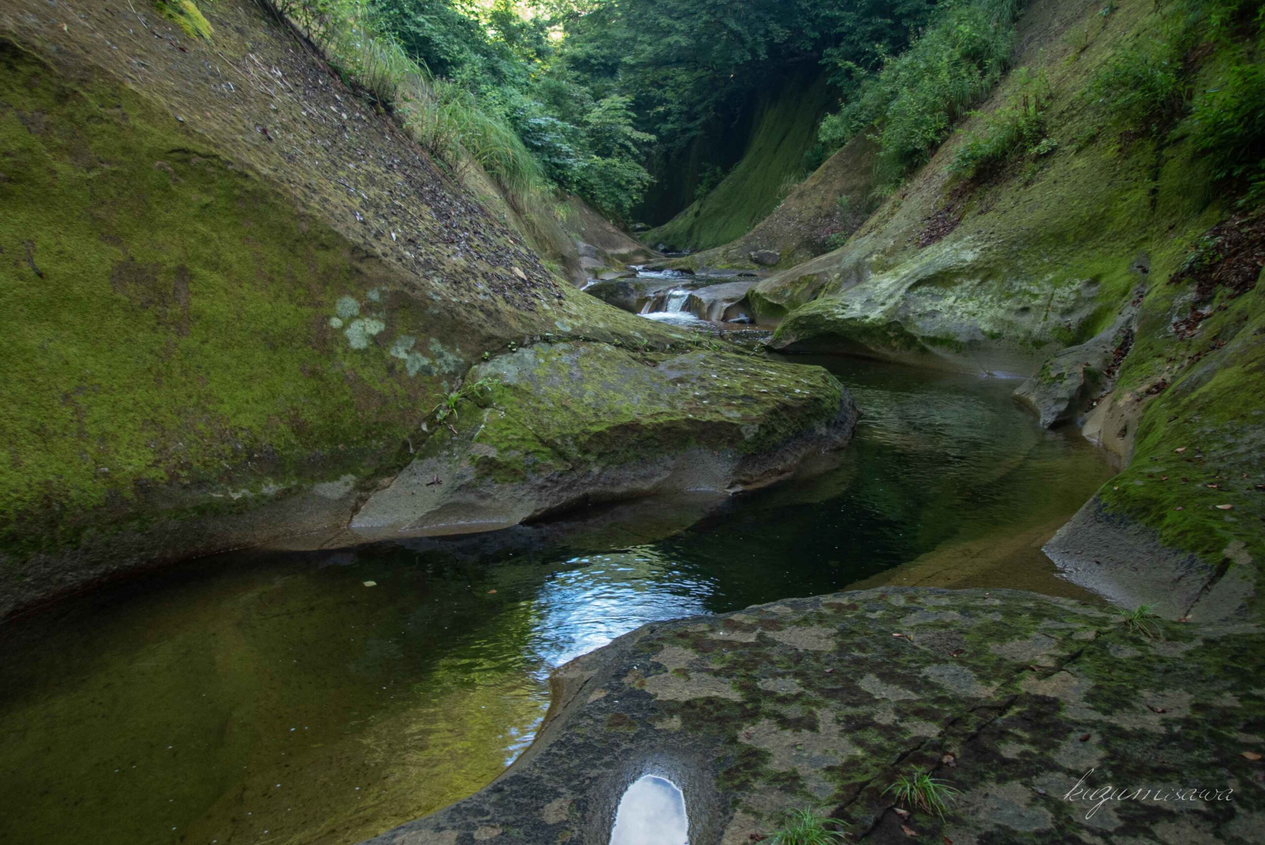 屈曲した水路と苔が目立つ泥岩の側壁。