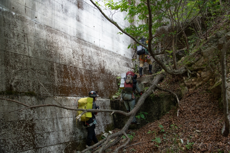 右岸に支点が残っていたので、そこから懸垂下降で降りる。