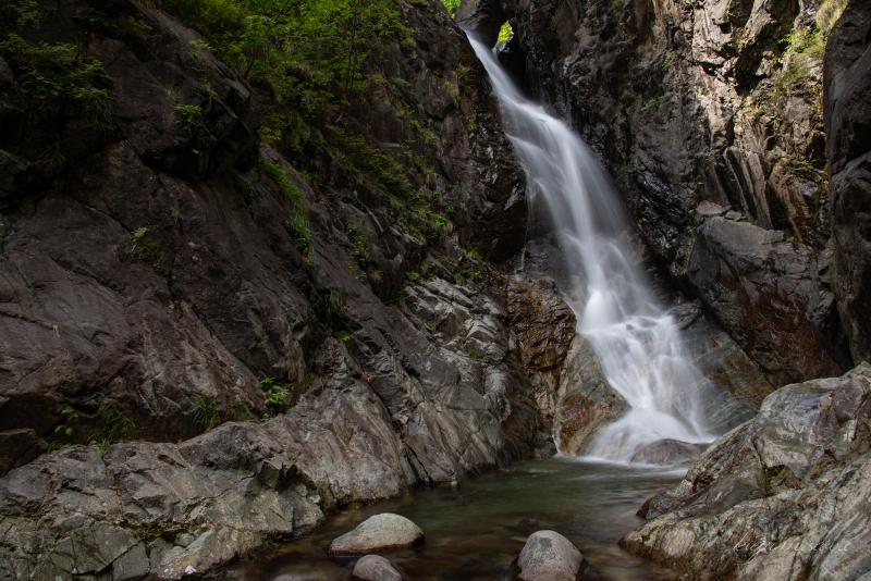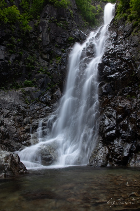 落口から勢いよく飛び出る一段目が、岩盤にぶつかり、飛沫を散らしながら滝壺へ落ちてゆく