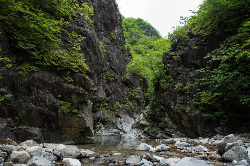右岸の大岩壁の先は平凡なゴーロが続いているので、歩いていてもあまり面白くはない。