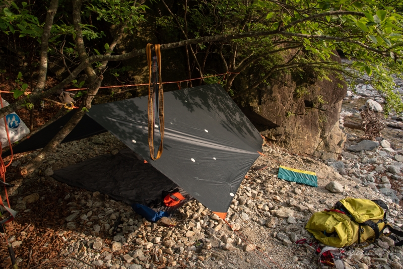 三沢と松木川の出合にテン場一等地を見つけたので、ここにタープを張る。