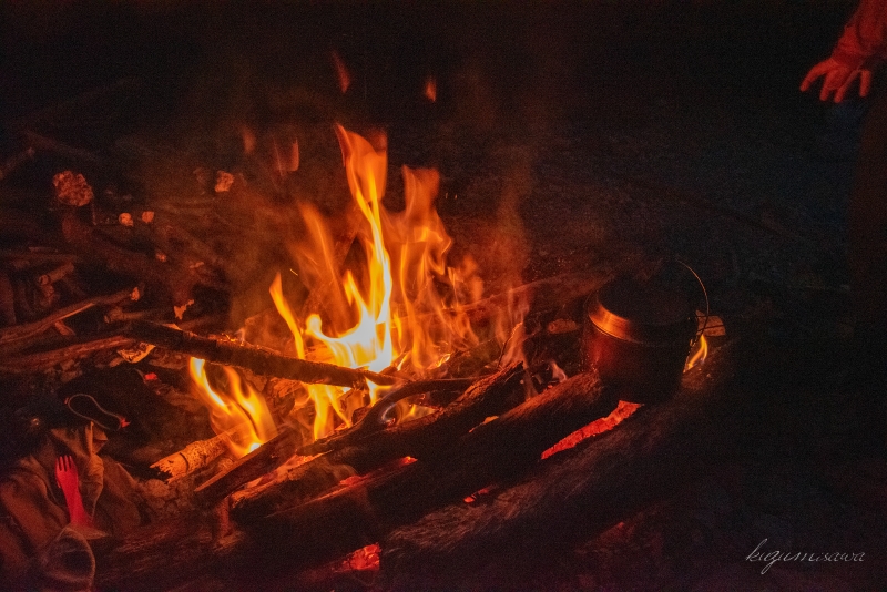 ゆっくりと意識がおちてゆくが、焚火が弱くなるとさすがにまだこの季節は寒く、私は一足早くタープに撤収した。