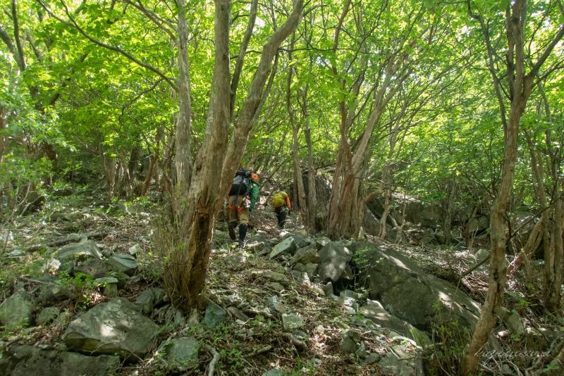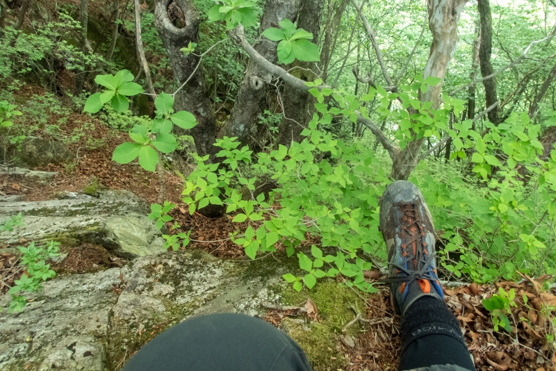 尾根の途中で岩体が飛び出ており先に進めないようなところがあるが、右手から慎重に巻いて先へ進める。