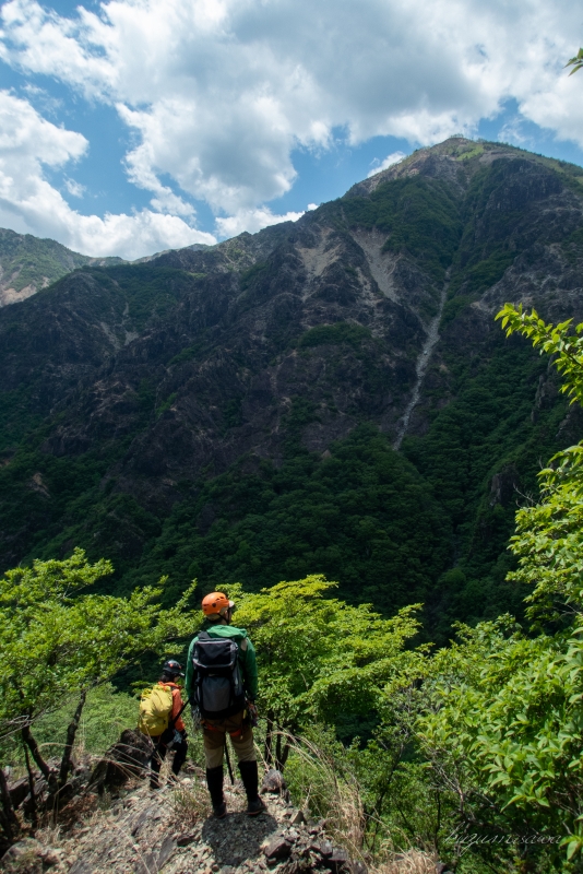 尾根を進んでゆくと、滝のすぐ前に出られそうなルンゼを見つけた。