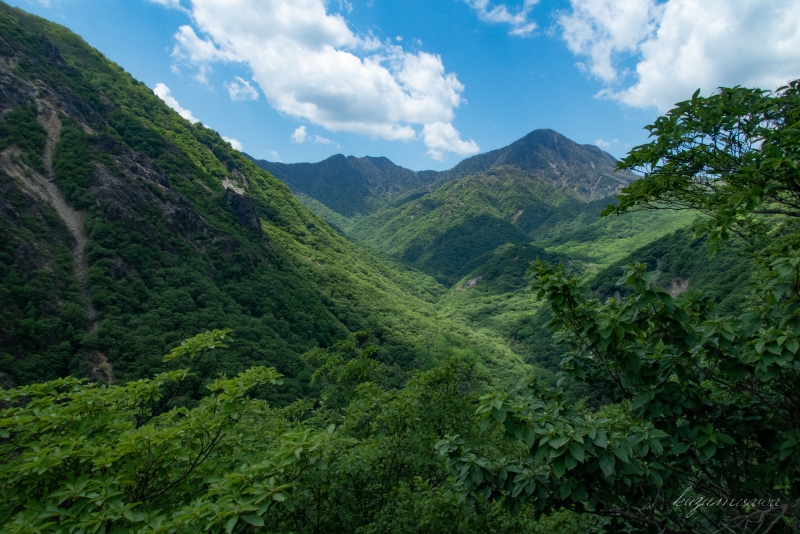 足尾の鉱毒の影響が少ない新緑の森と先に見える皇海山と鋸山。