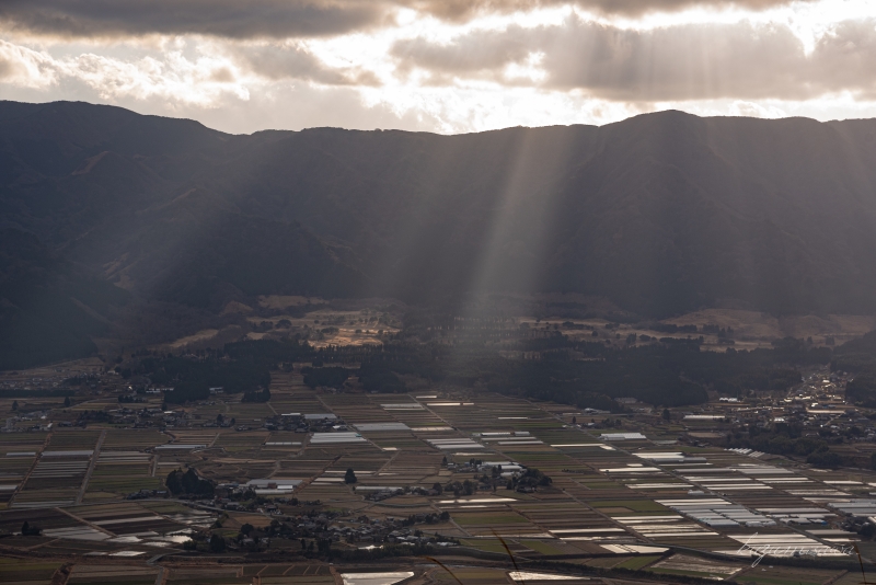 外輪山からこぼれる光が阿蘇カルデラを照らす。