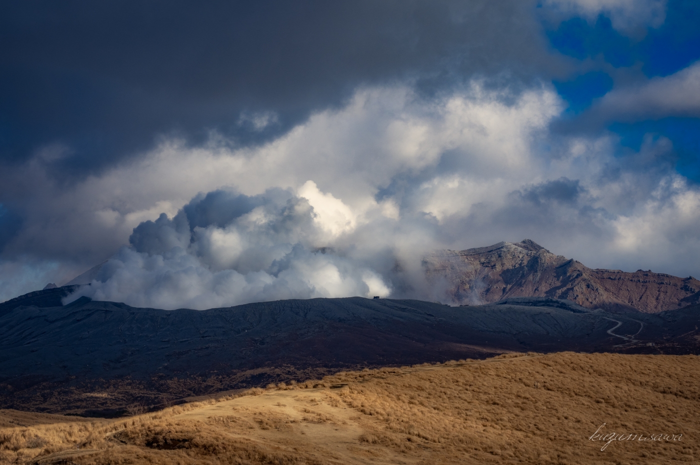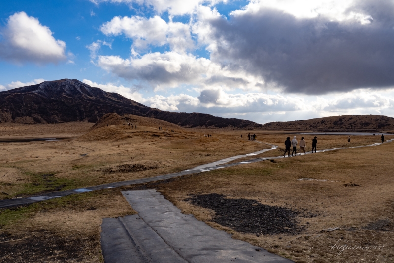 風が強く、寒さが染みるが景色は美しく阿蘇の雄大さを感じる。
