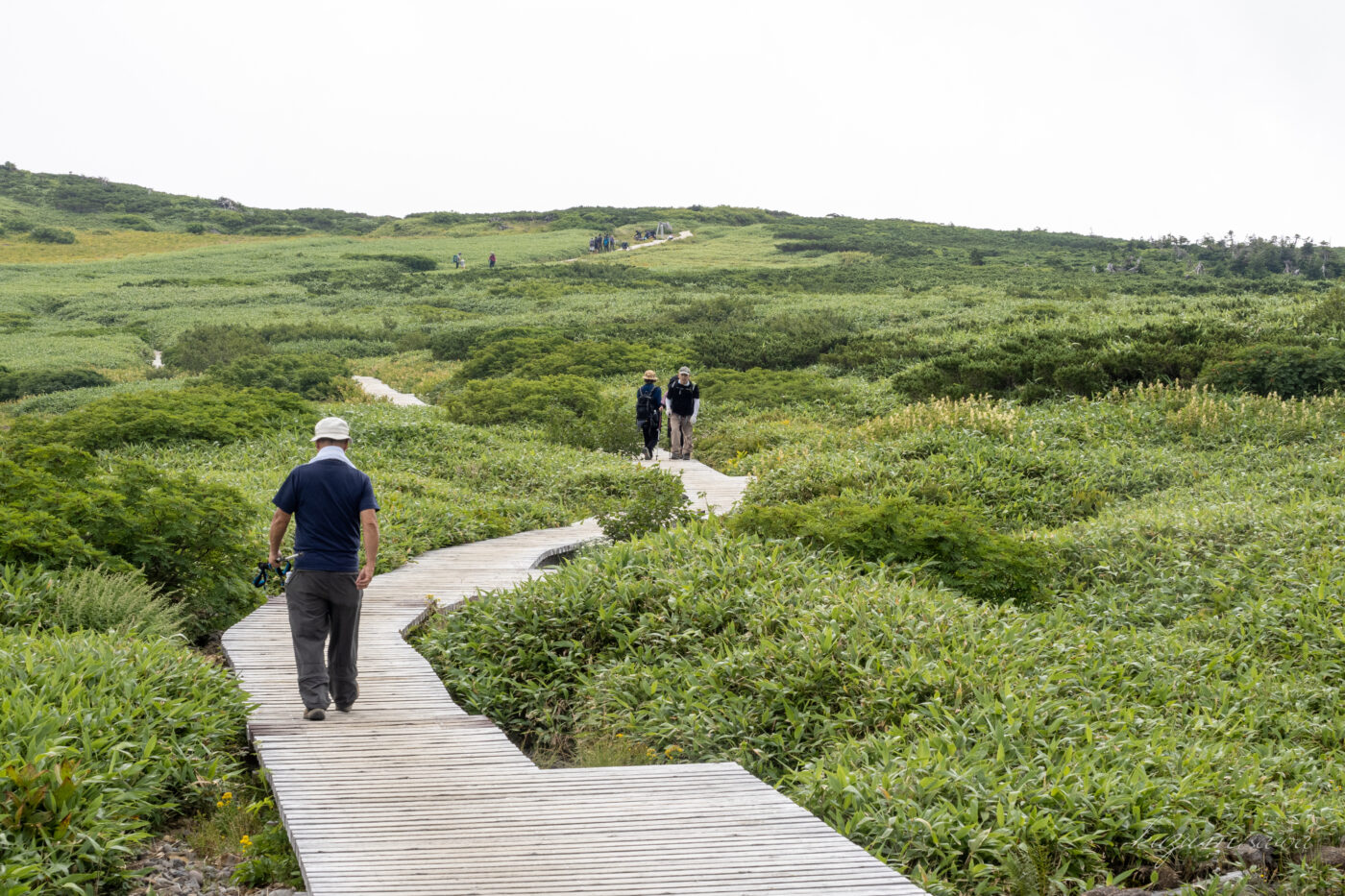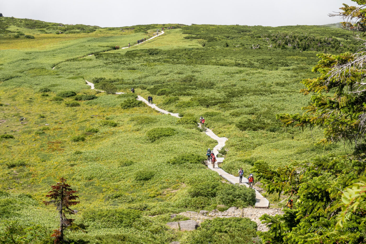 湿原に伸びる木道と前方に見える白山御前峰、緑が美しいハイマツ。