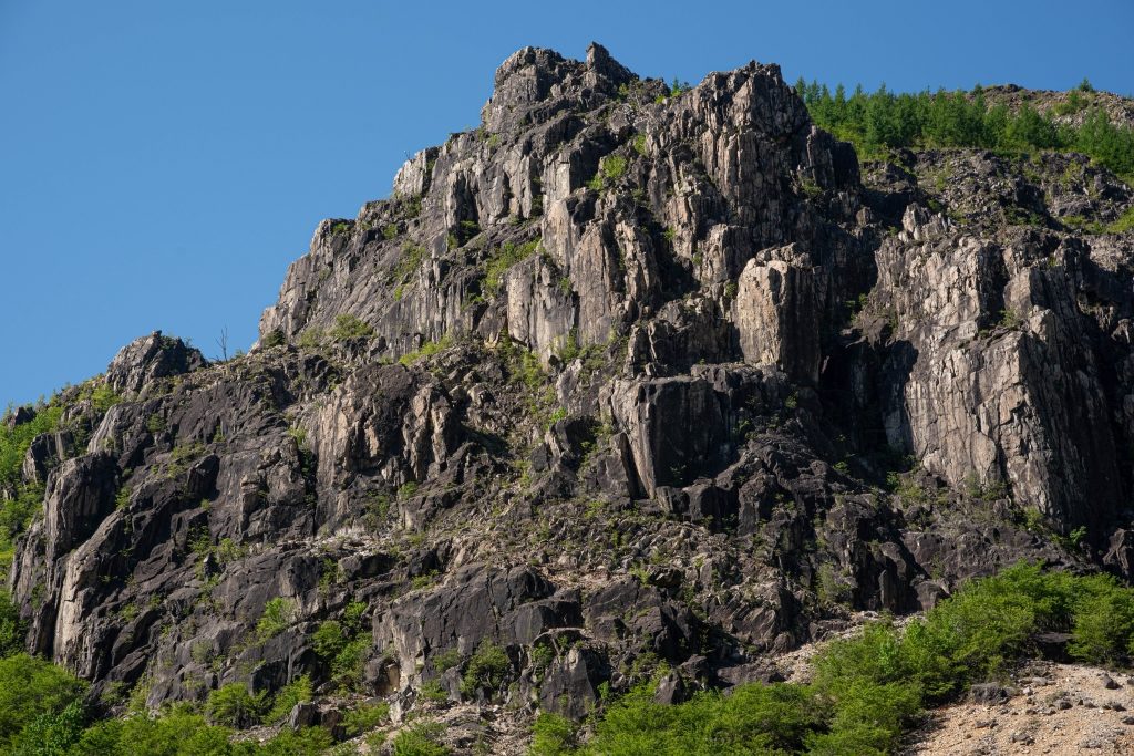 左手に松木渓谷の大岩壁を眺めながら歩いていきます