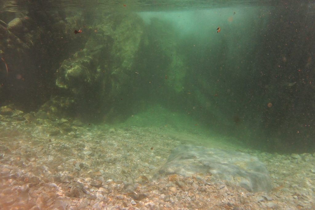 イワナ(っぽい)魚影が餌にふら~と寄ってくるのですが、なかなか食いつかない状況が続きます